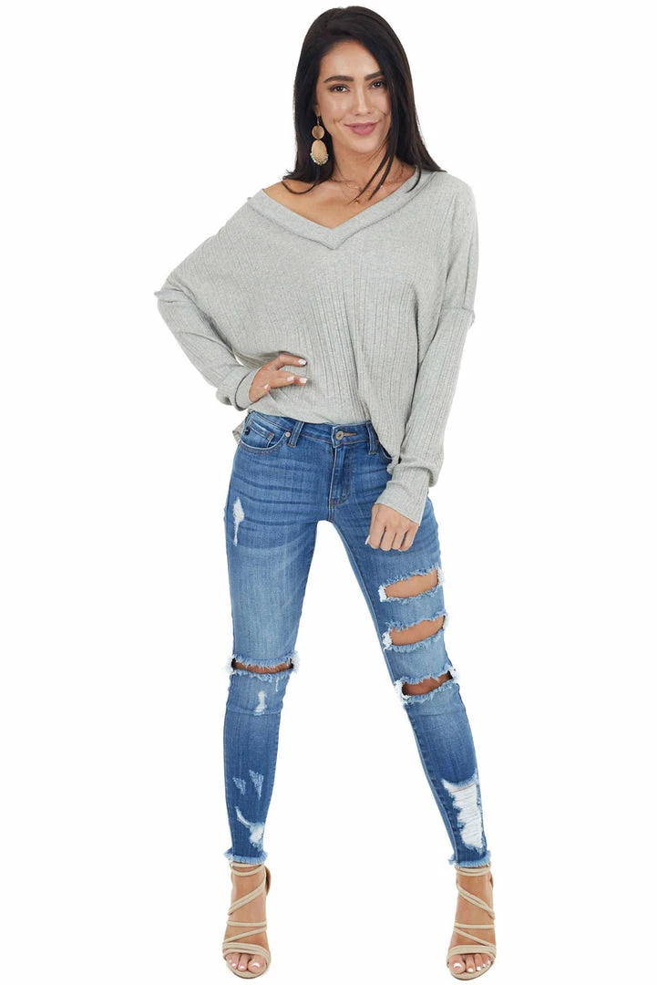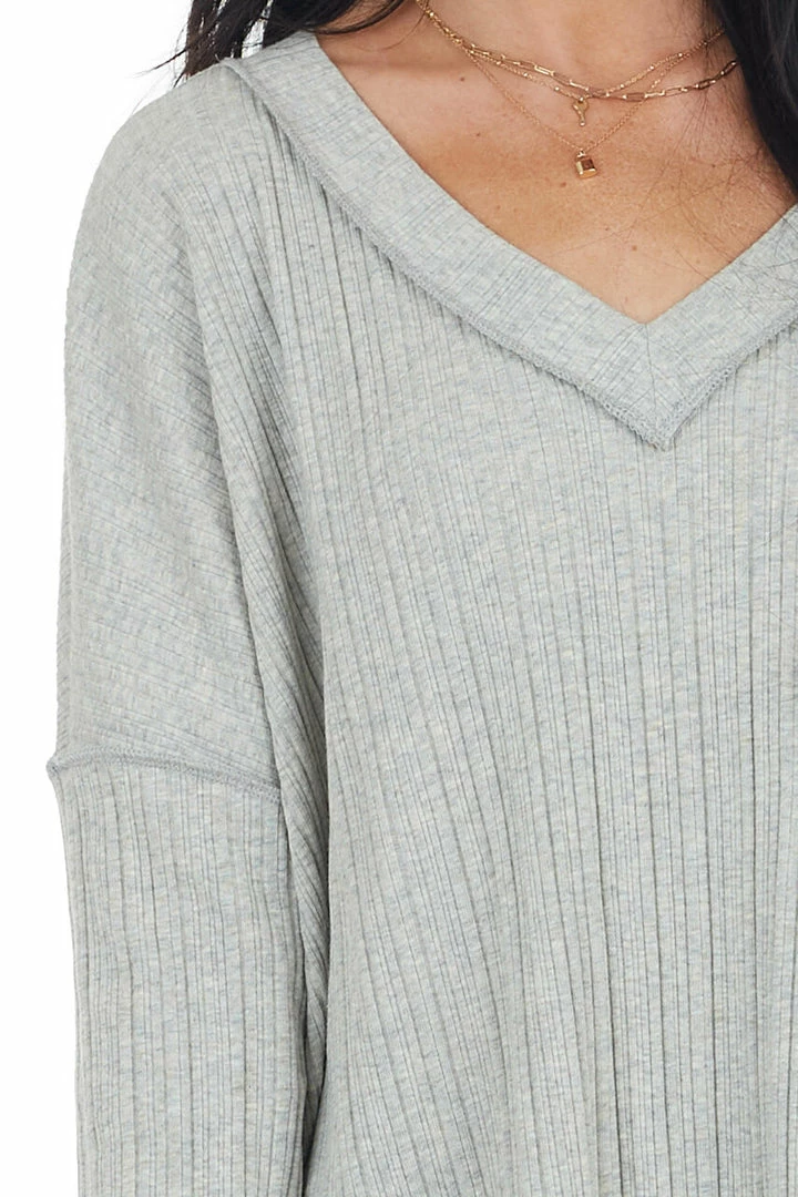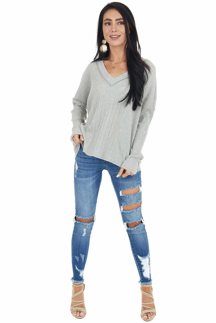 - Heather Grey Variegated Ribbed Knit Long Sleeve V Neck Top