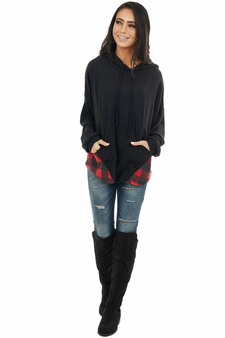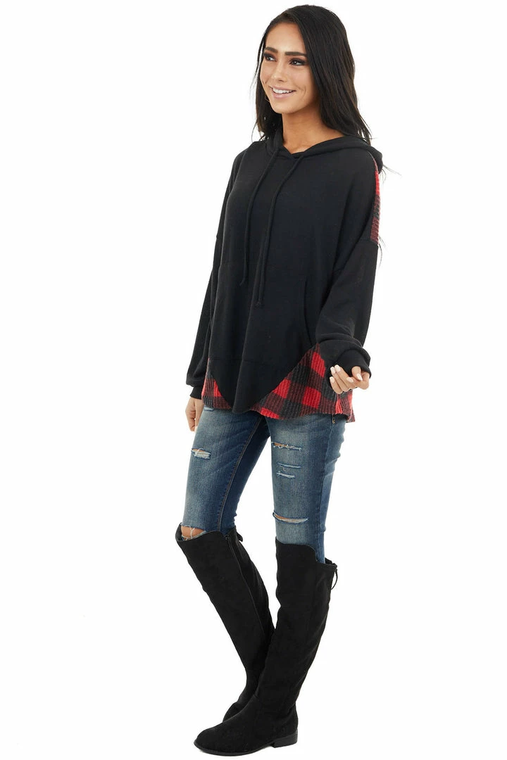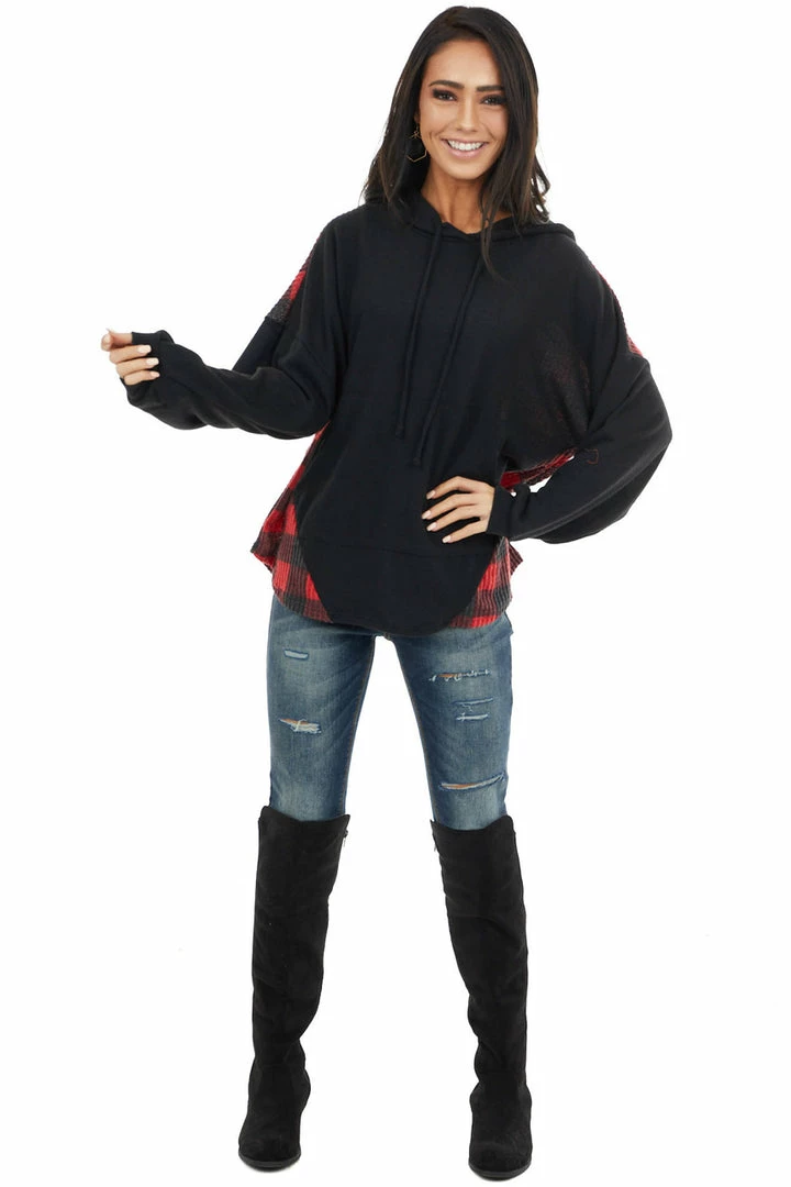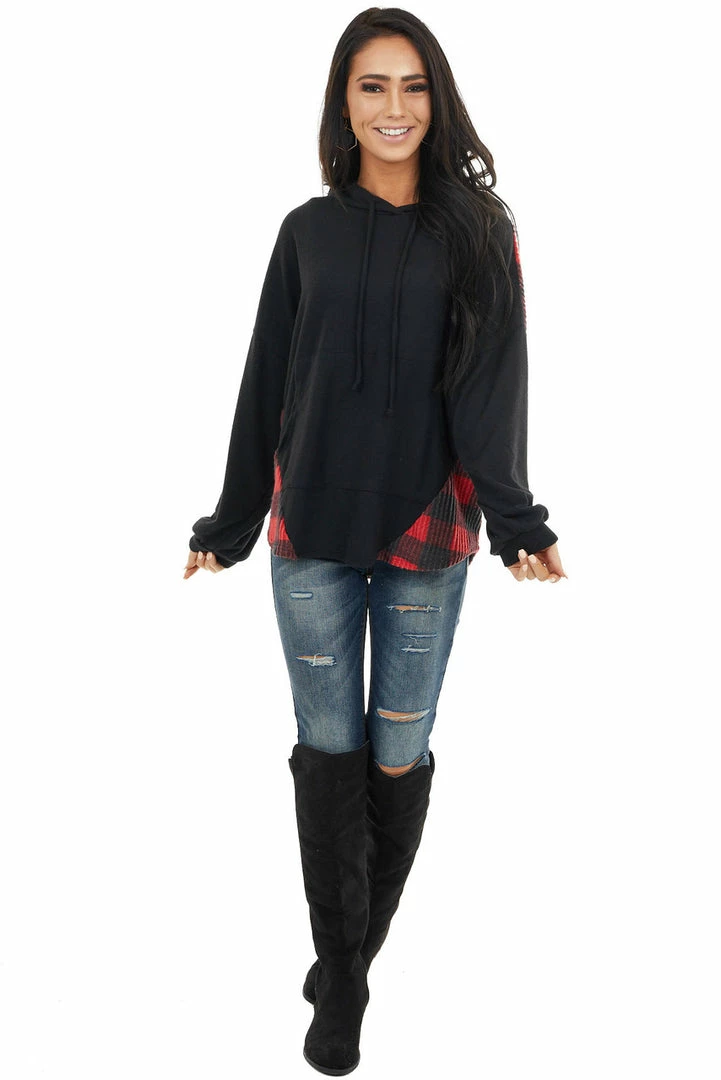 - Ruby and Black Buffalo Plaid Hoodie with Working Tie detail