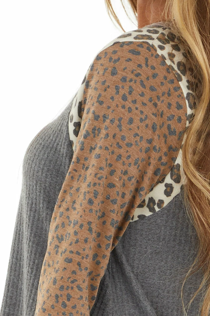 - Stone Multiprint Waffle Knit Top with Leopard Long Sleeves