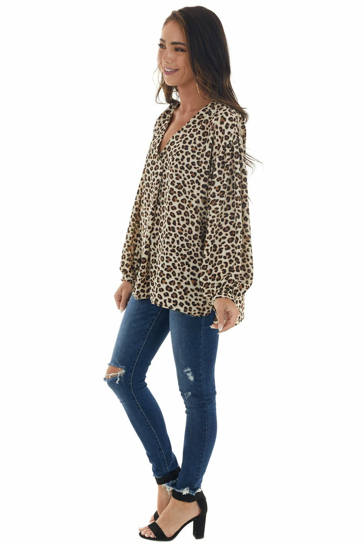 - Beige Leopard Print Long Puff Sleeve Woven Top