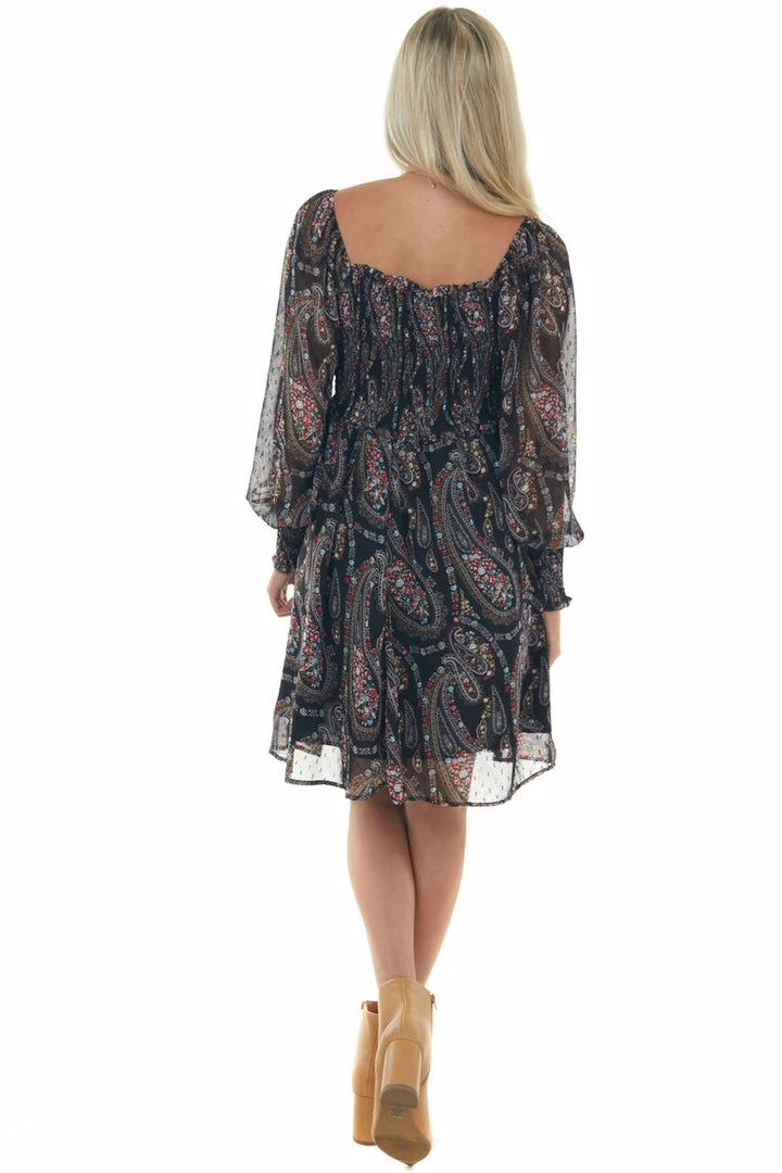 - Black Paisley Print Smocked Woven Short Dress