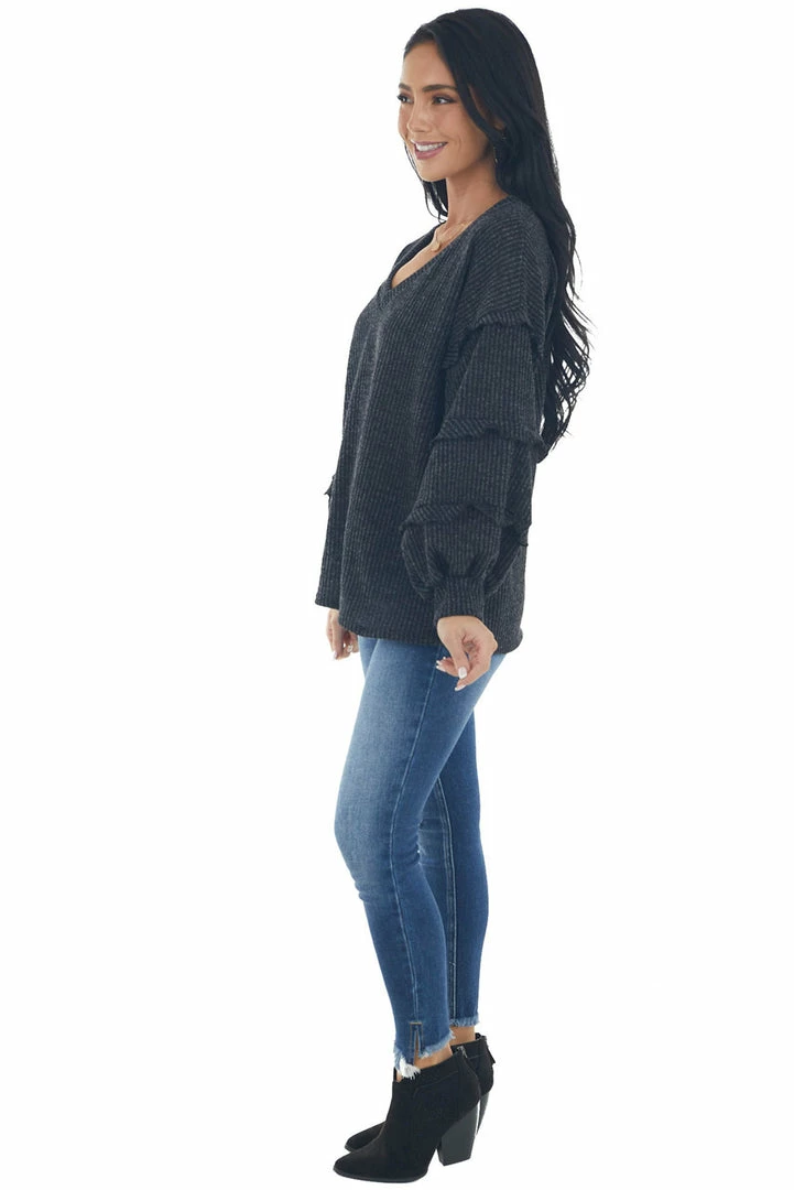 - Charcoal Ribbed Knit Top with Ruffle Puff Sleeves