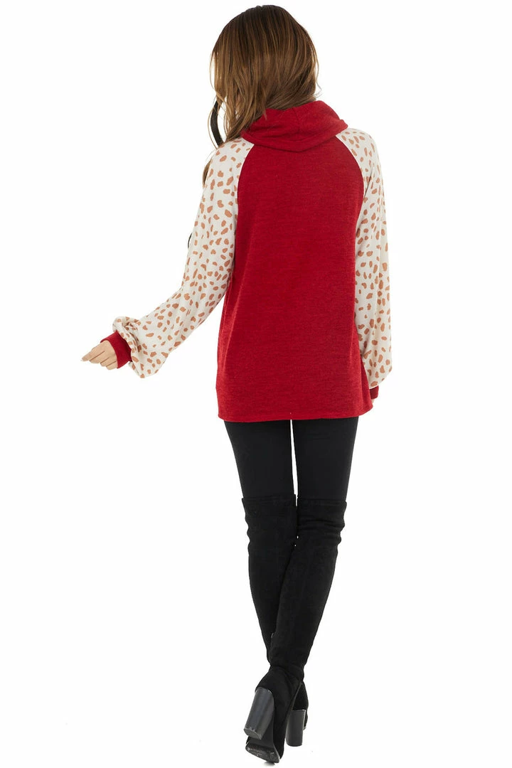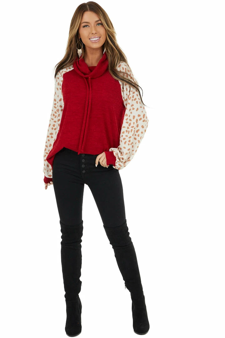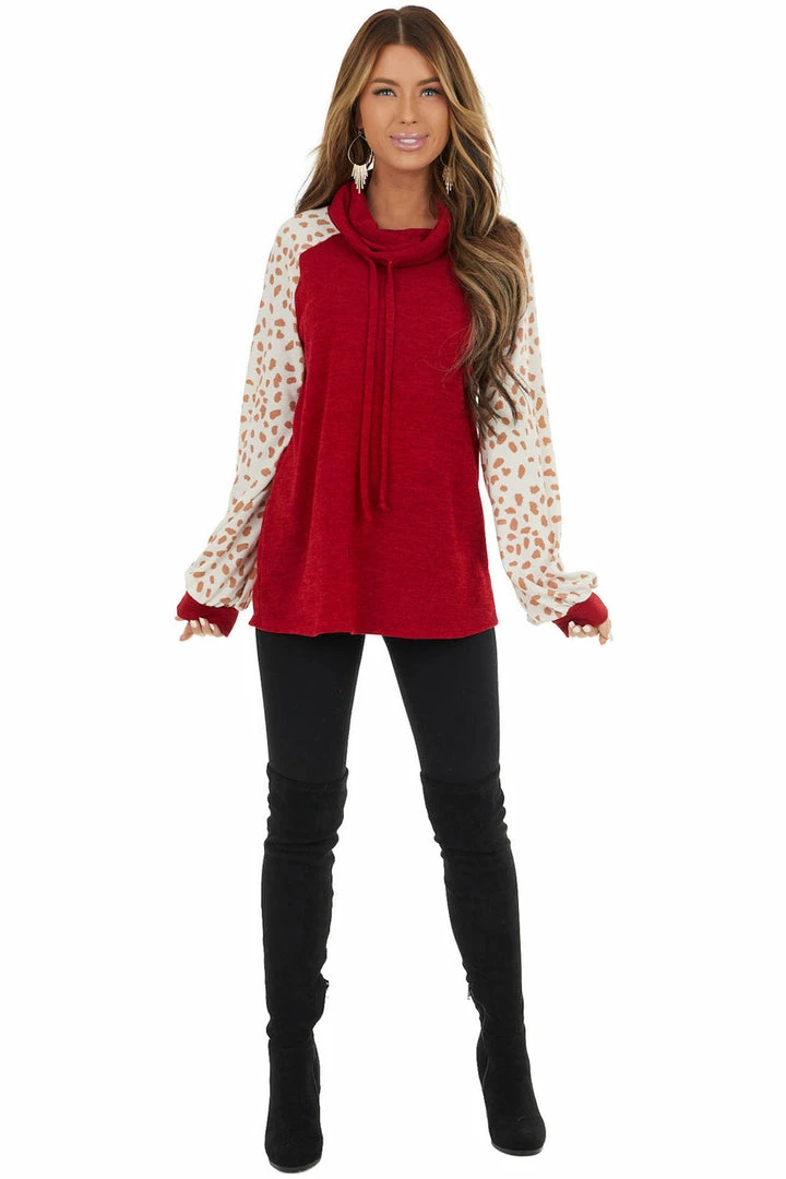 - Cherry Drawstring Cowl Neck Top with Cheetah Print Sleeves