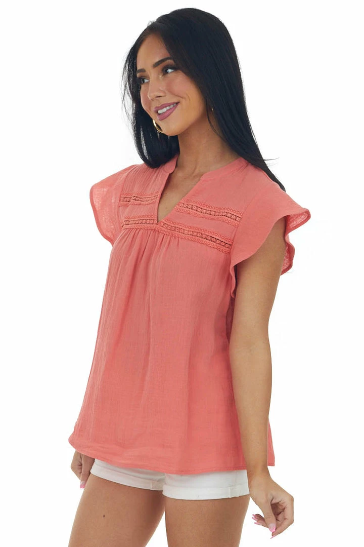 - Coral V Neck Lace Trim Flutter Short Sleeve Top