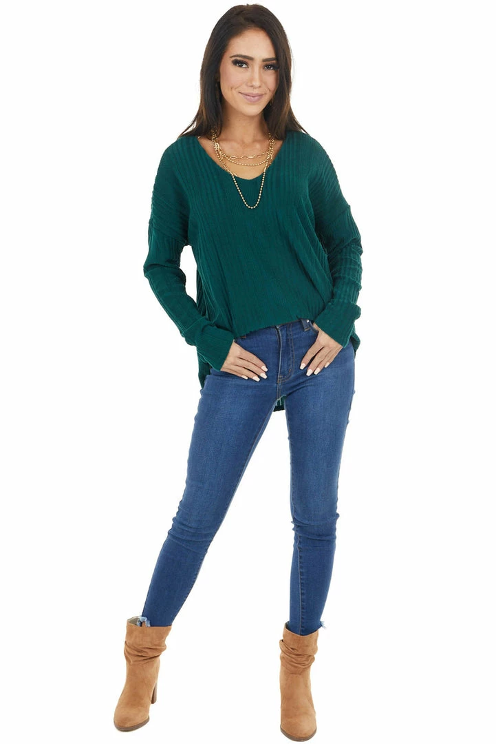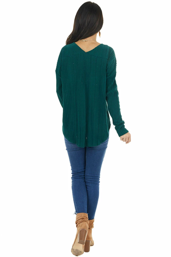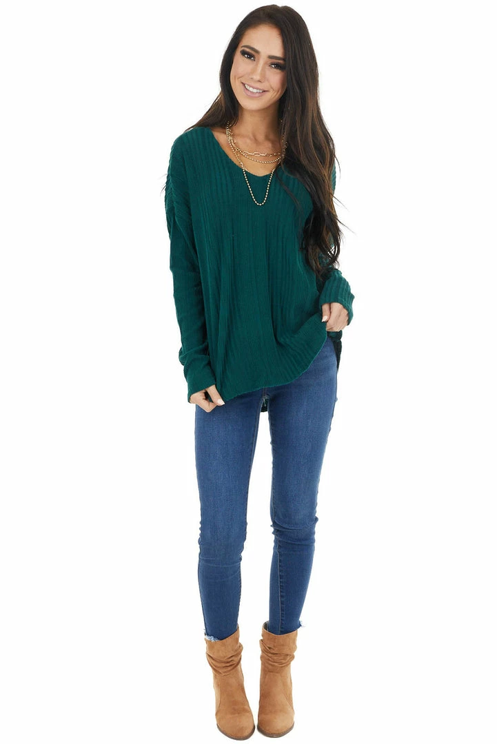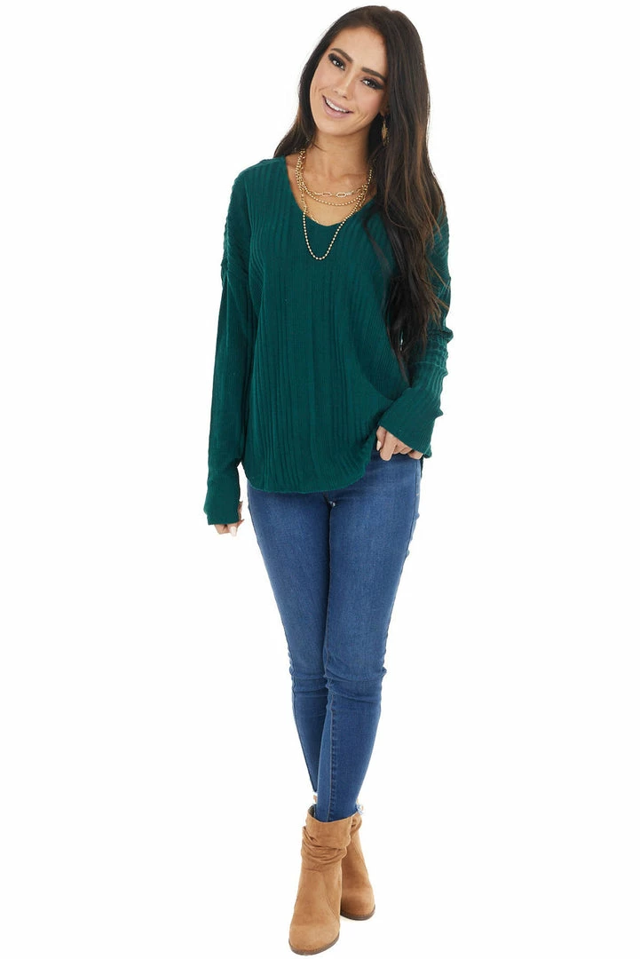 - Dark Pine Long Sleeve Wide Neck Knit Top with Ribbed Detail