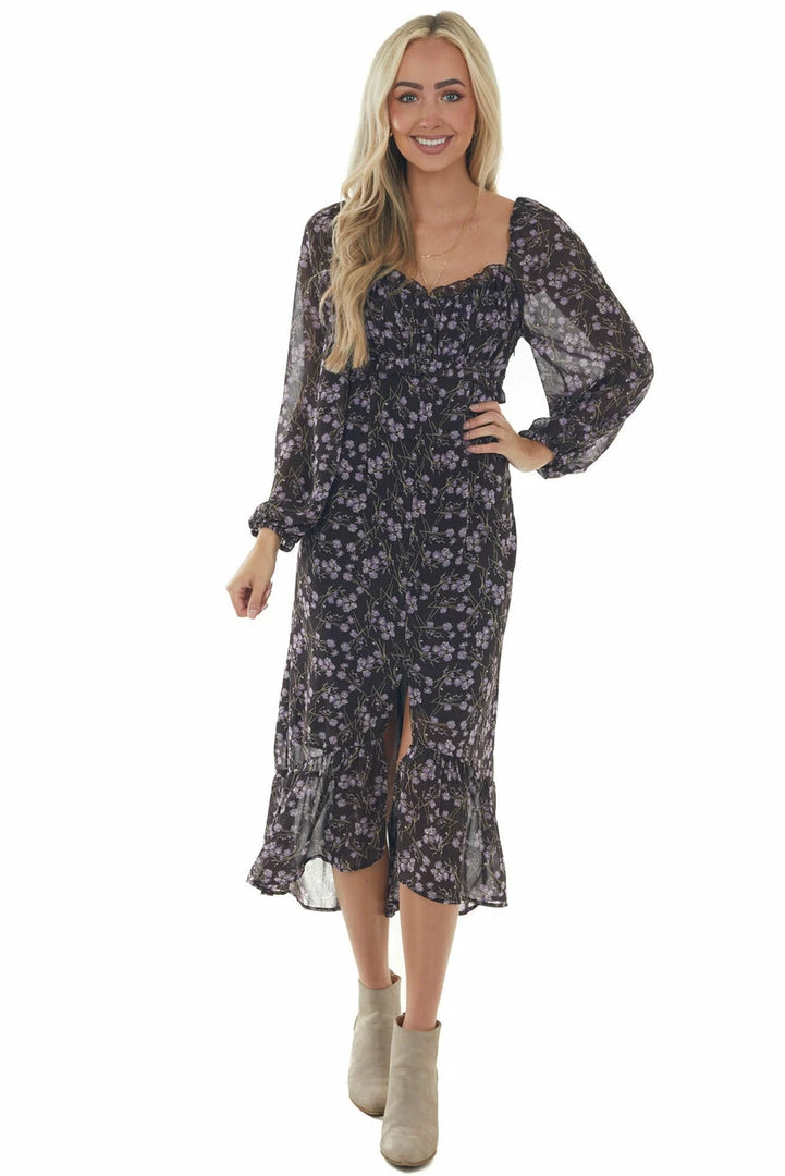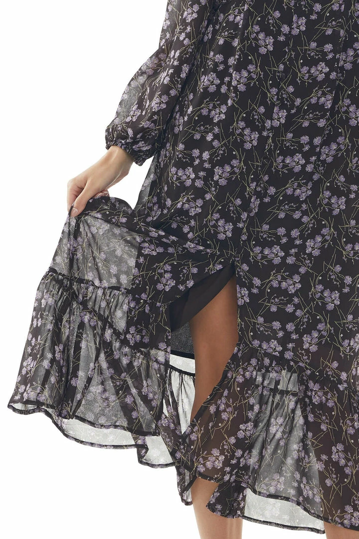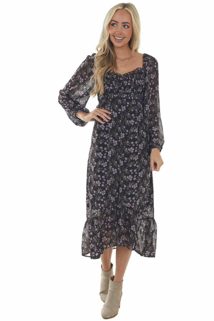 - Cocoa Brown Floral Bubble Sleeve Midi Dress
