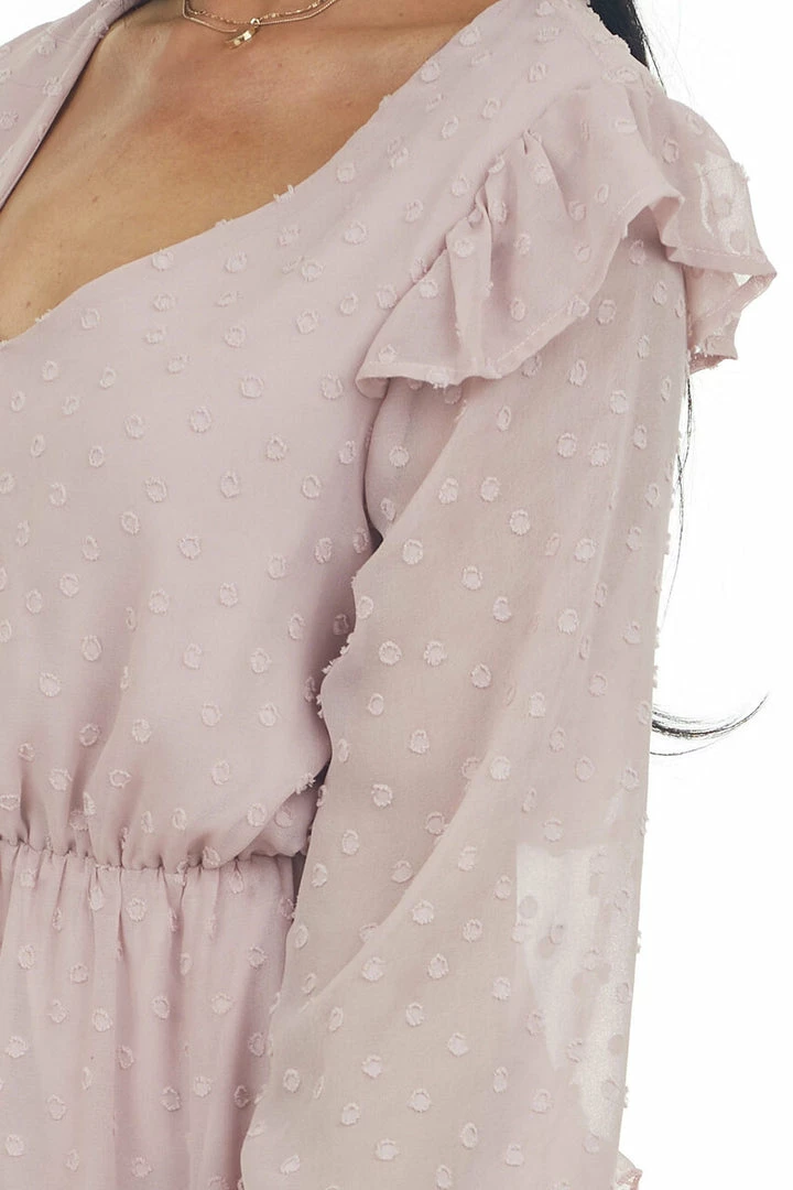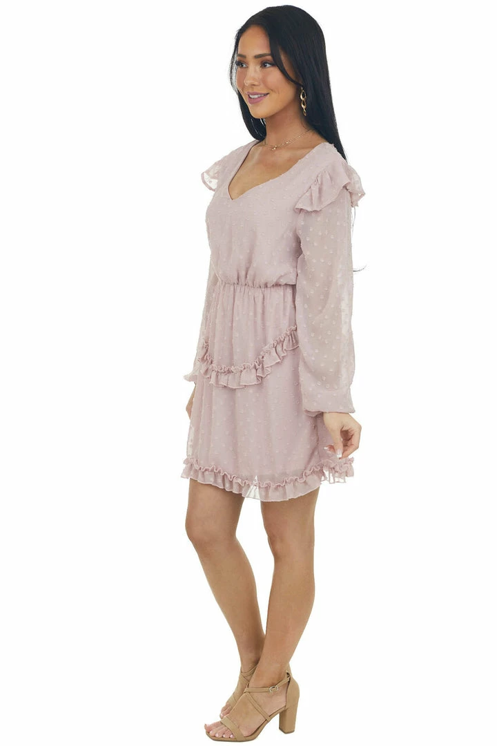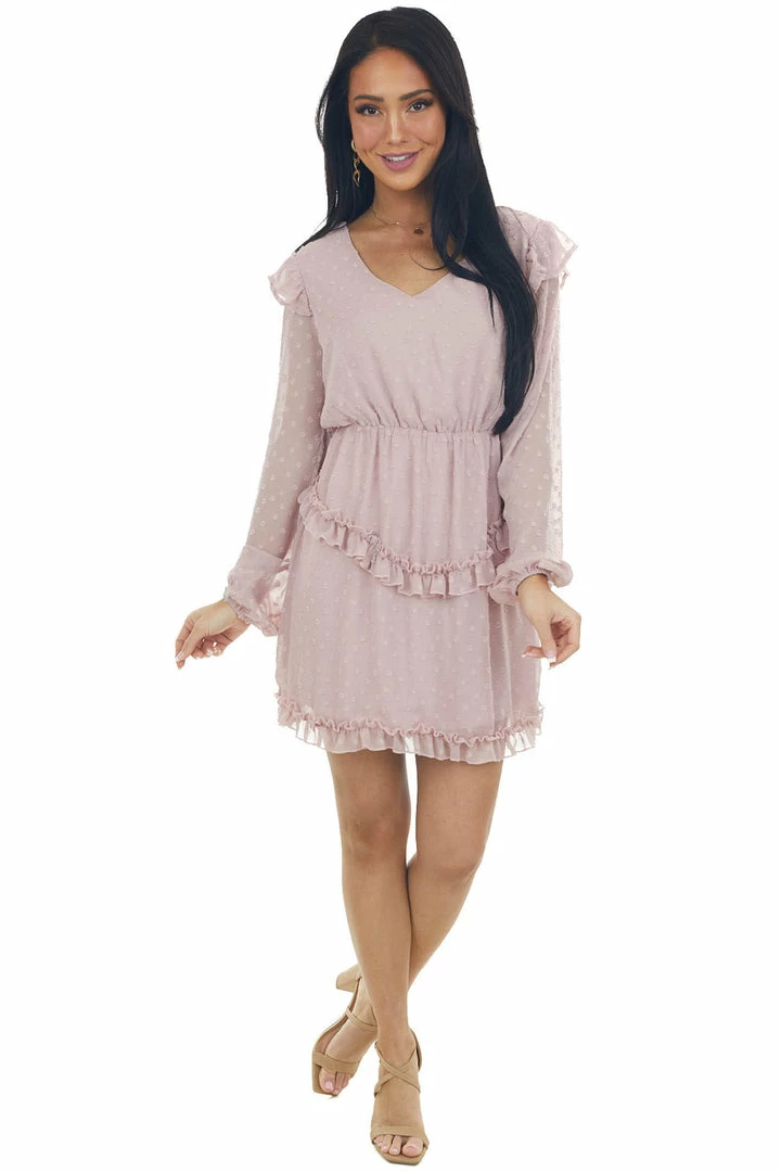 - Dusty Blush Long Sleeve Ruffle Swiss Dot Dress