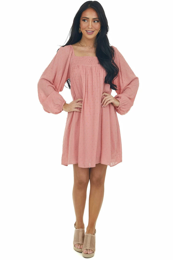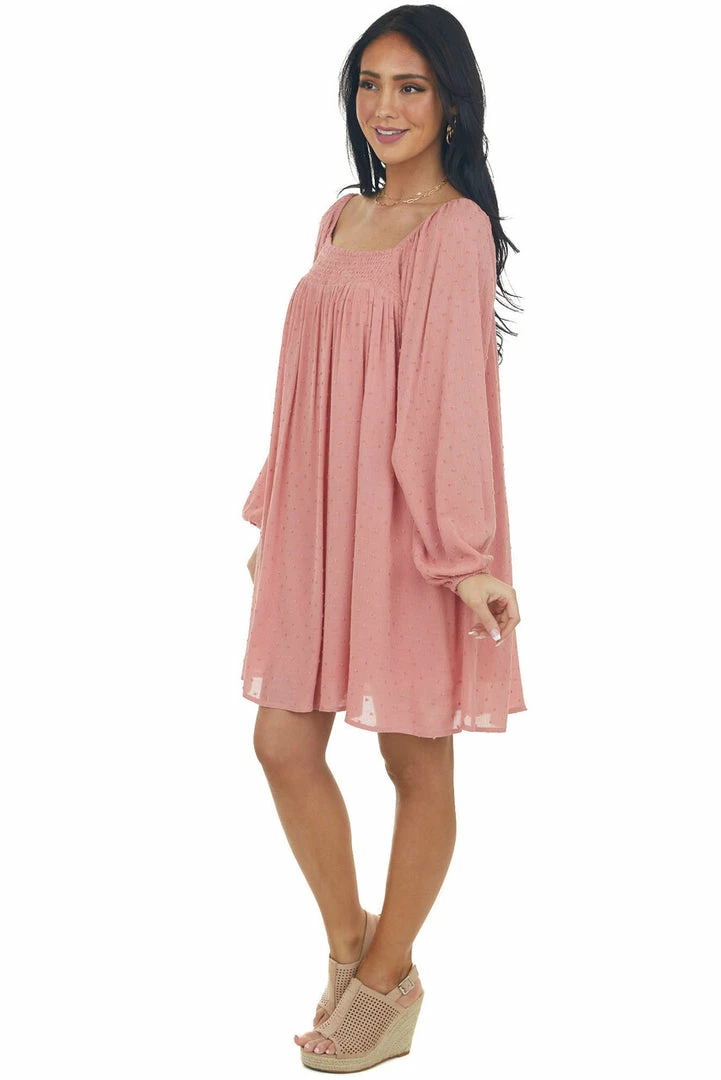 - Hazy Coral Swiss Dot Square Neck Flowy Dress