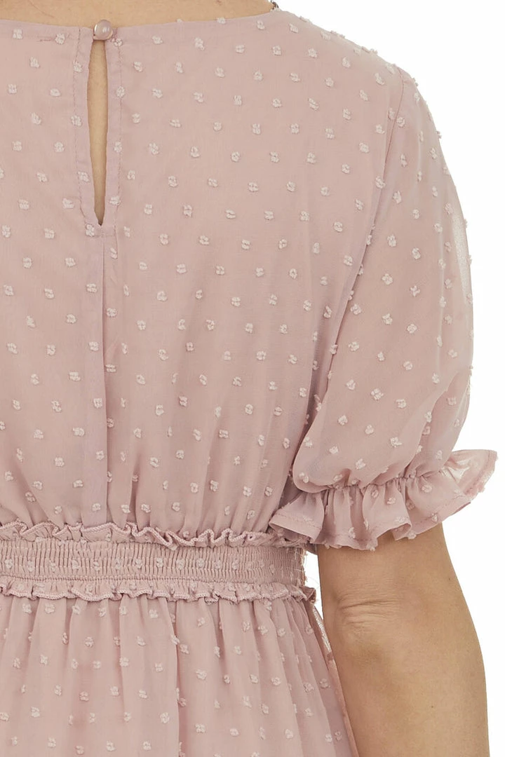 - Dusty Blush Puff Sleeve Tiered Swiss Dot Mini Dress