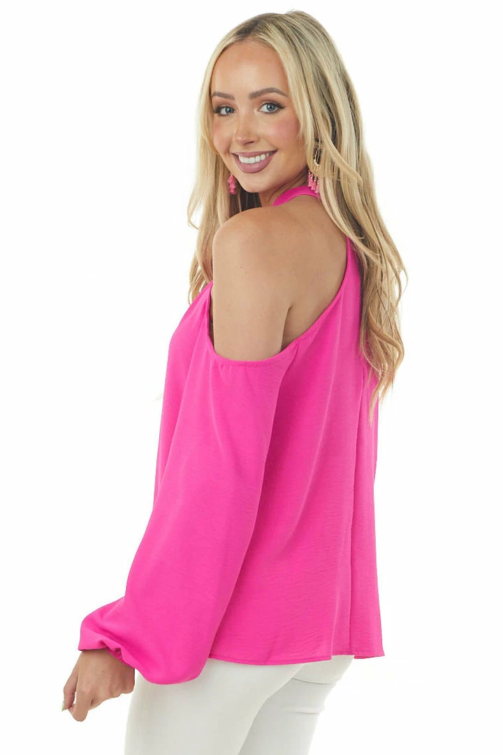 - Fuchsia Cold Shoulder Bubble Sleeve Halter Top