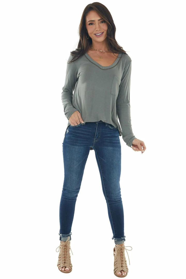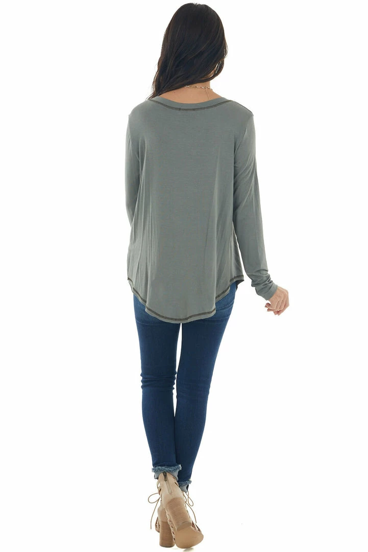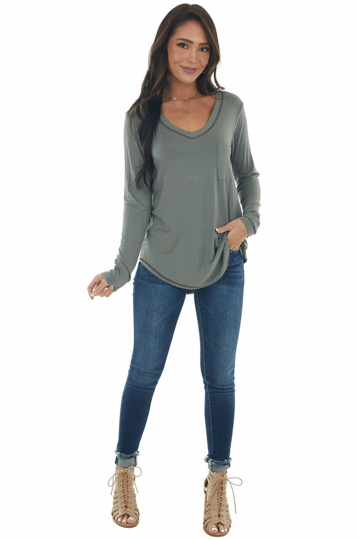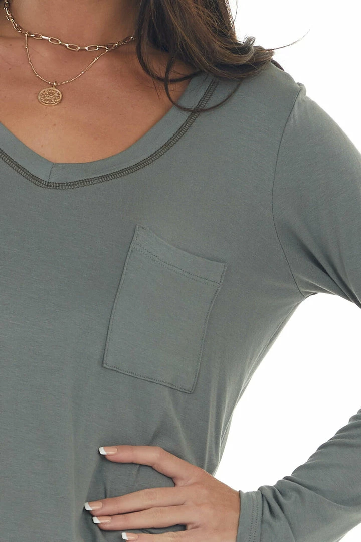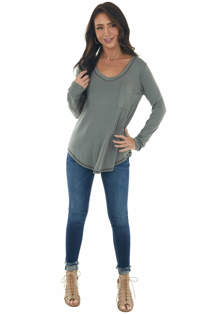 - Hazy Sage Exposed Stitch Chest Pocket Knit Top