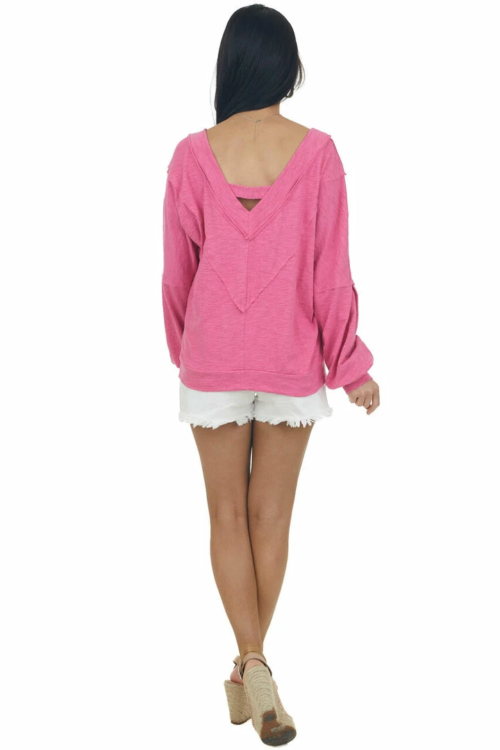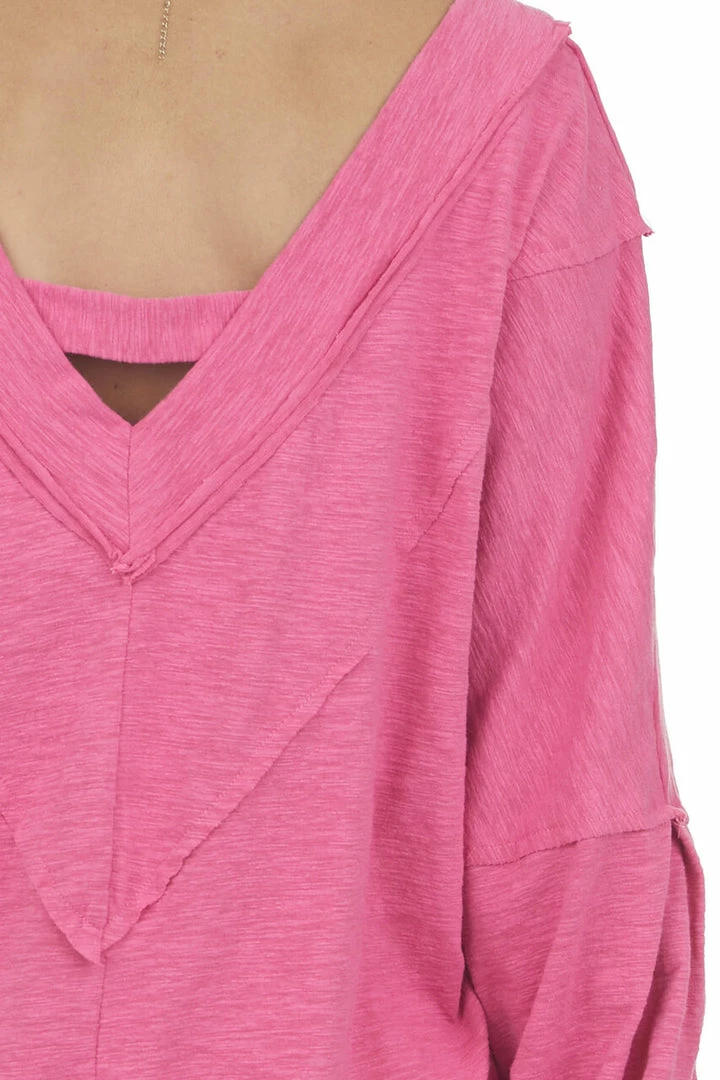 - Heathered Magenta Raw Edge V Neck Knit Top
