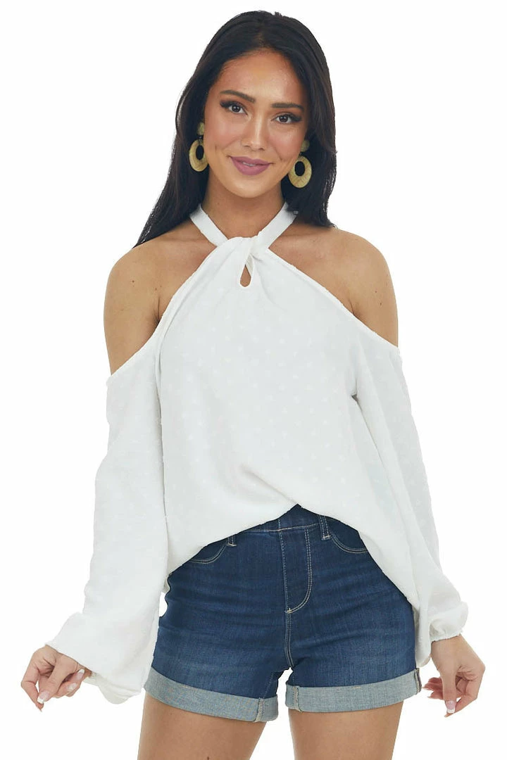 - Ivory Swiss Dot Cold Shoulder Halter Blouse