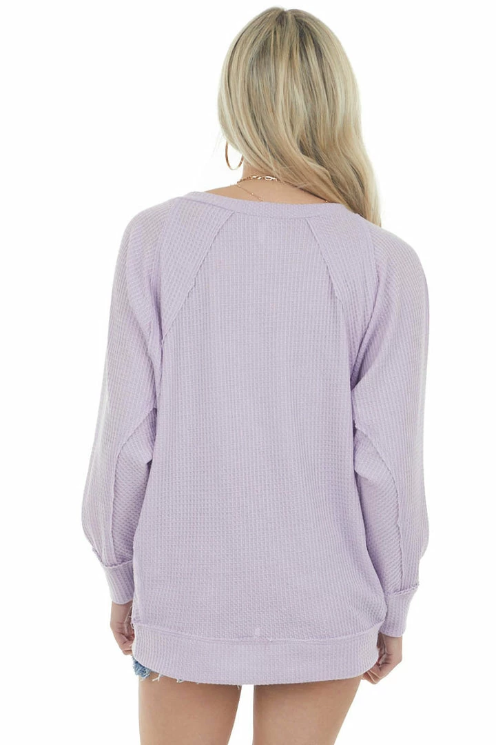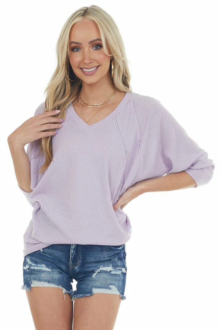 - Lavender V Neck Waffle Knit Raw Edge Top