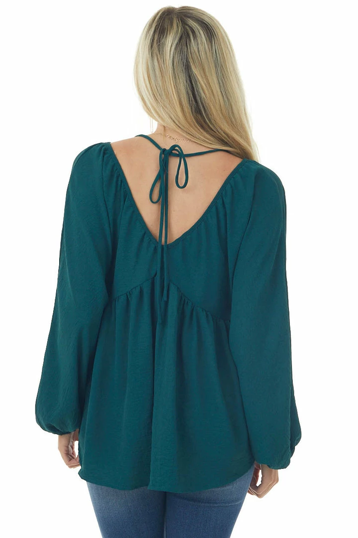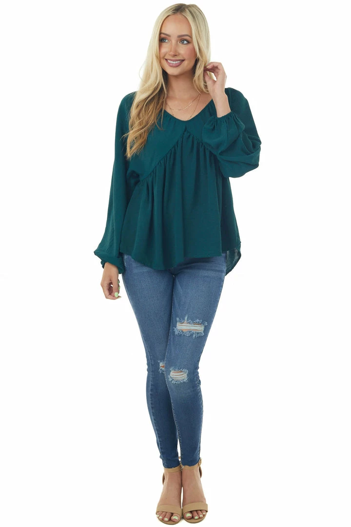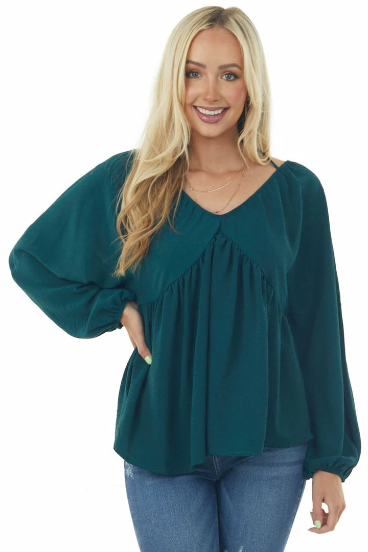 - Pine V Neck Babydoll Puff Sleeve Flowy Top