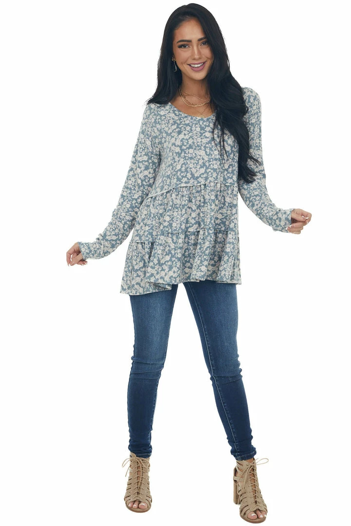 - Sea Blue Floral Tiered Super Soft Knit Top