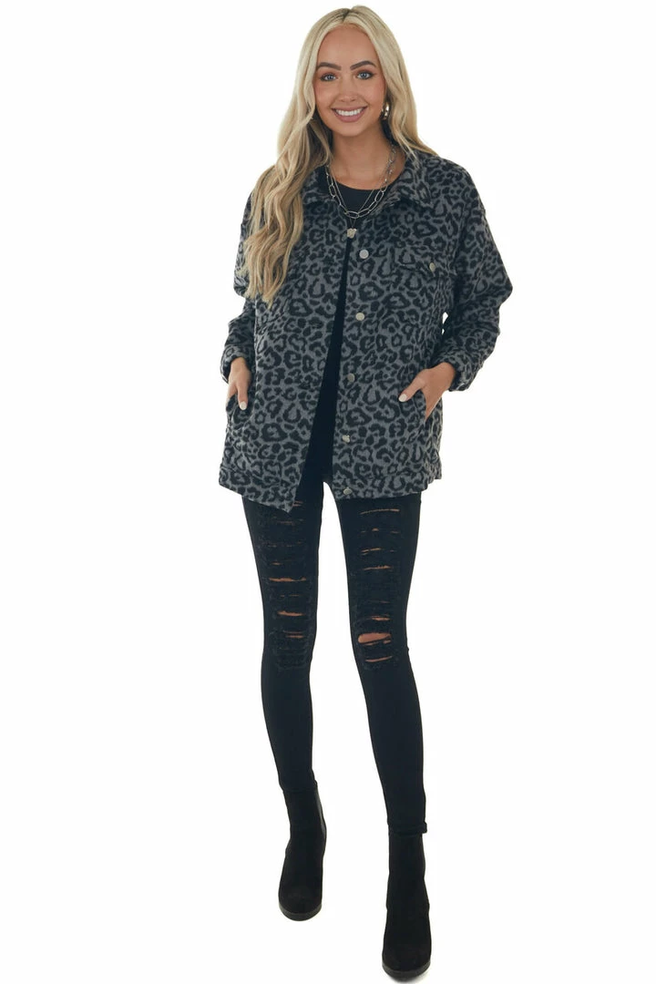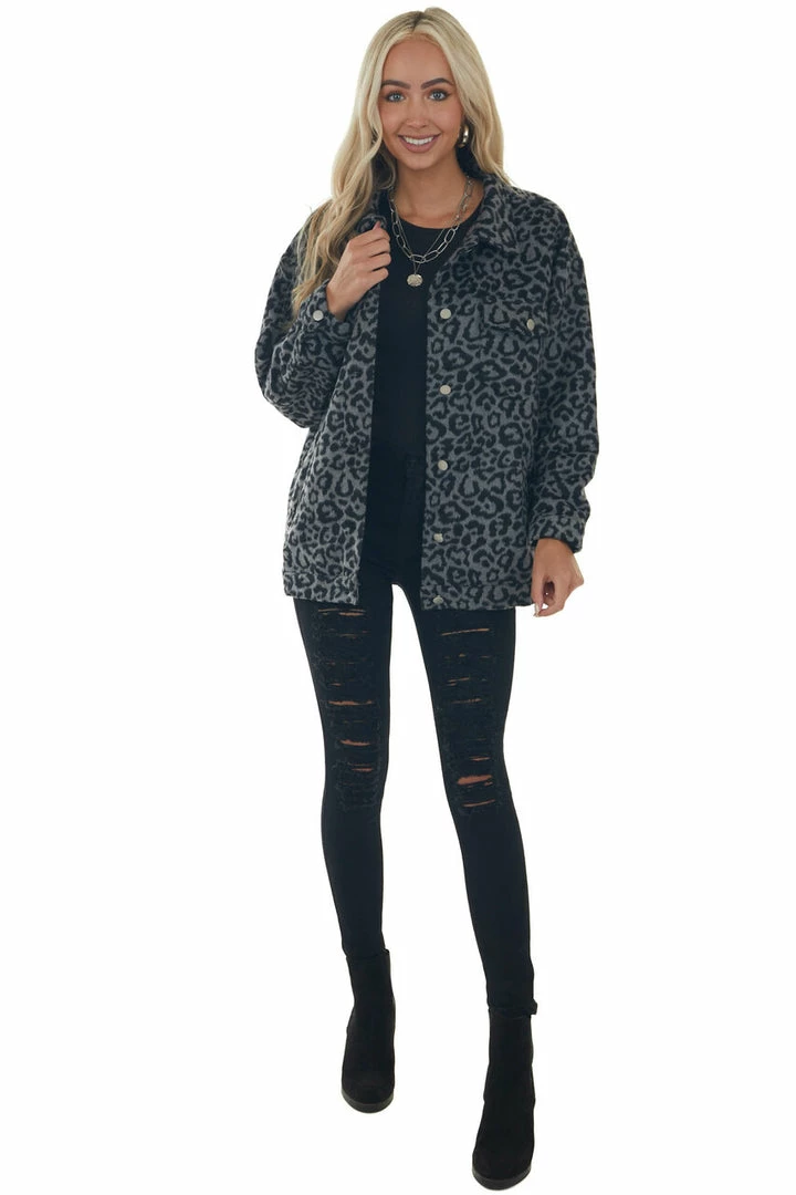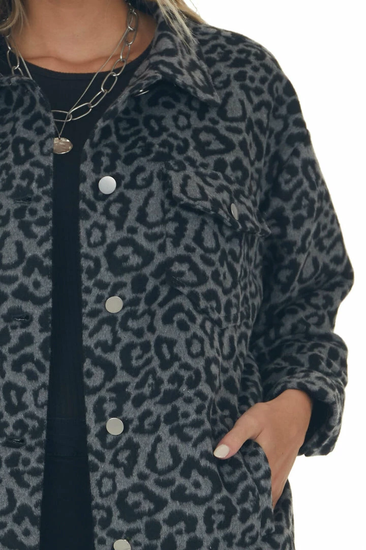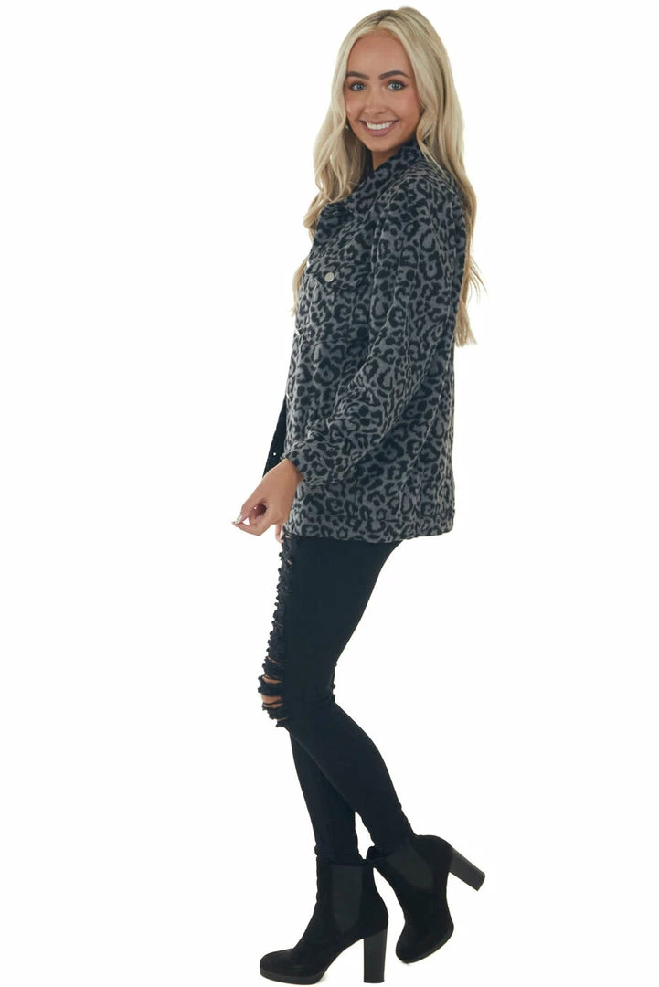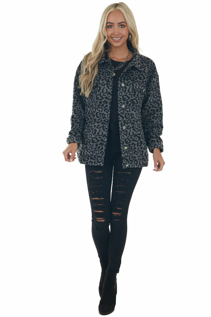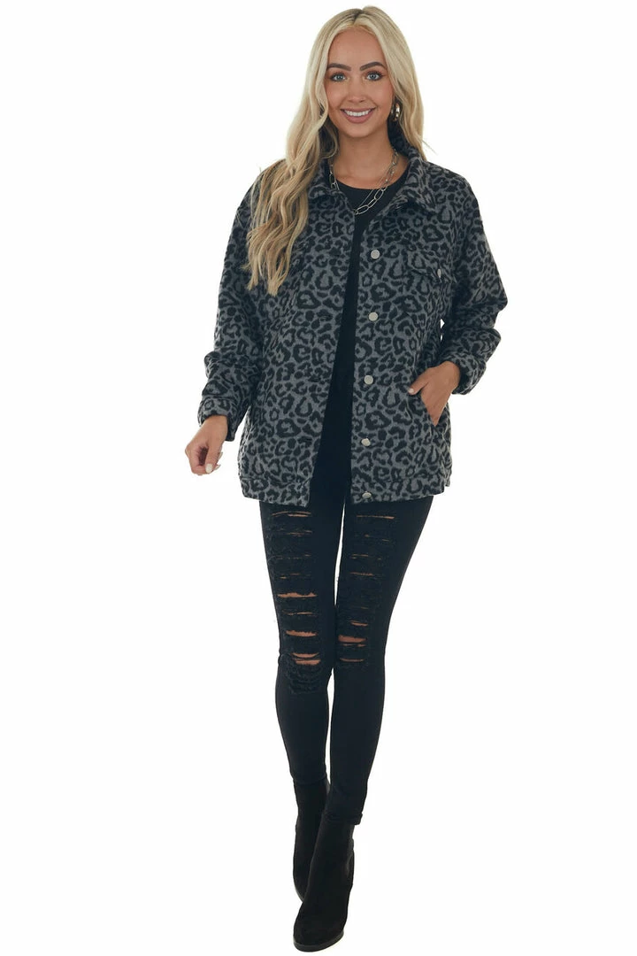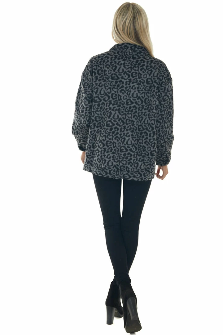 - Steel Grey Leopard Print Fuzzy Shirt Jacket