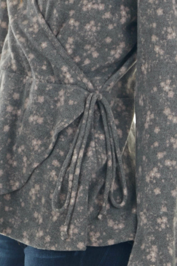 - Stone Grey Ditsy Floral Surplice Soft Knit Top