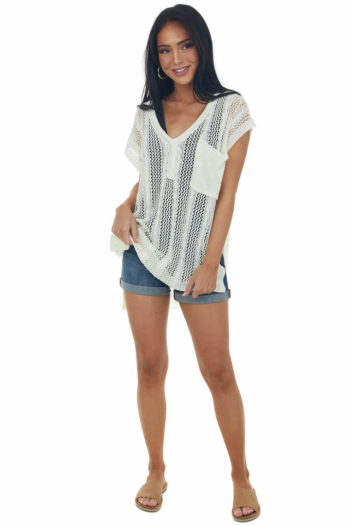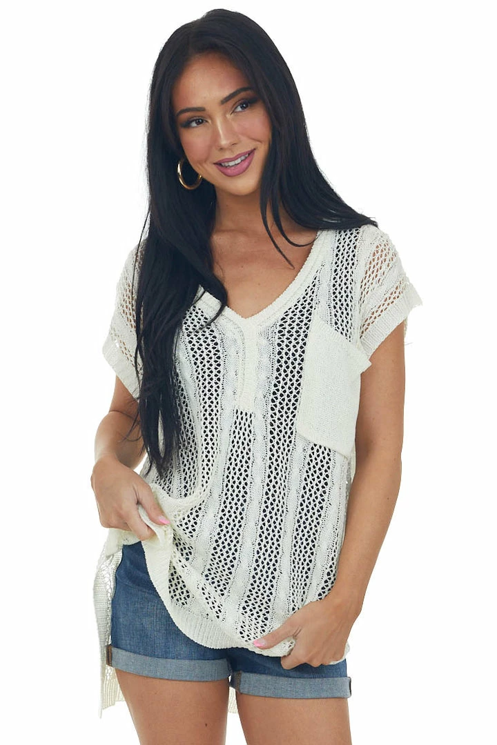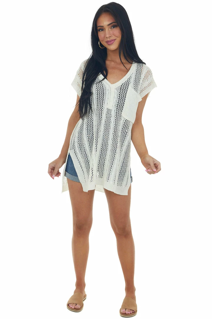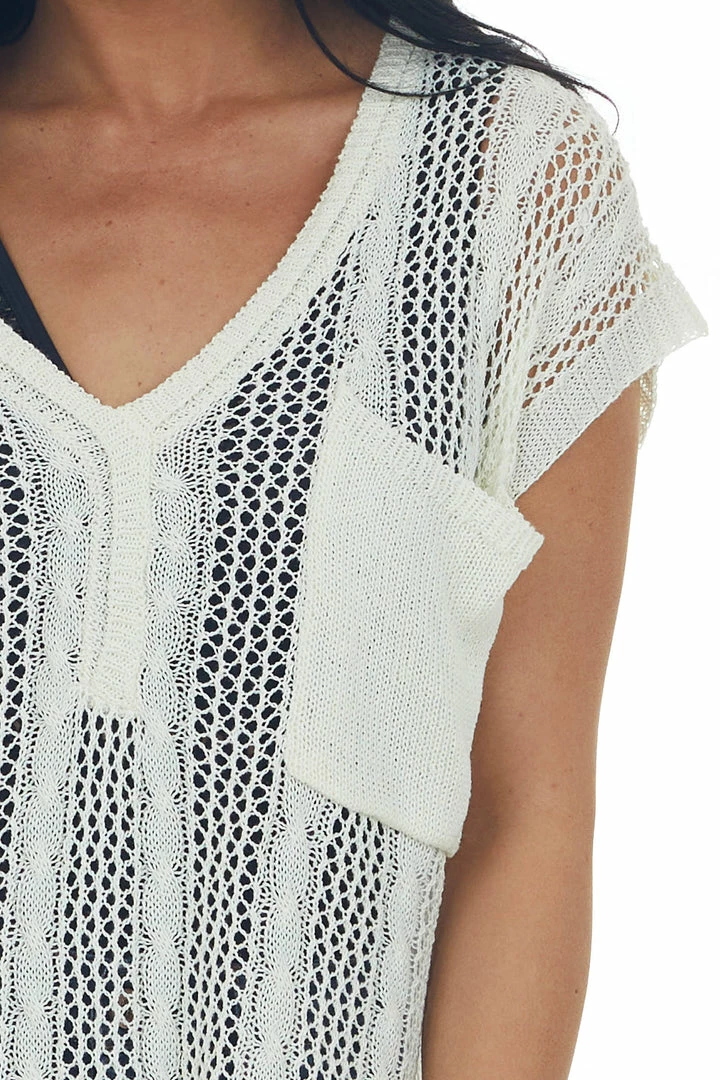 - Cream Short Sleeve Tunic Open Cable Knit Top
