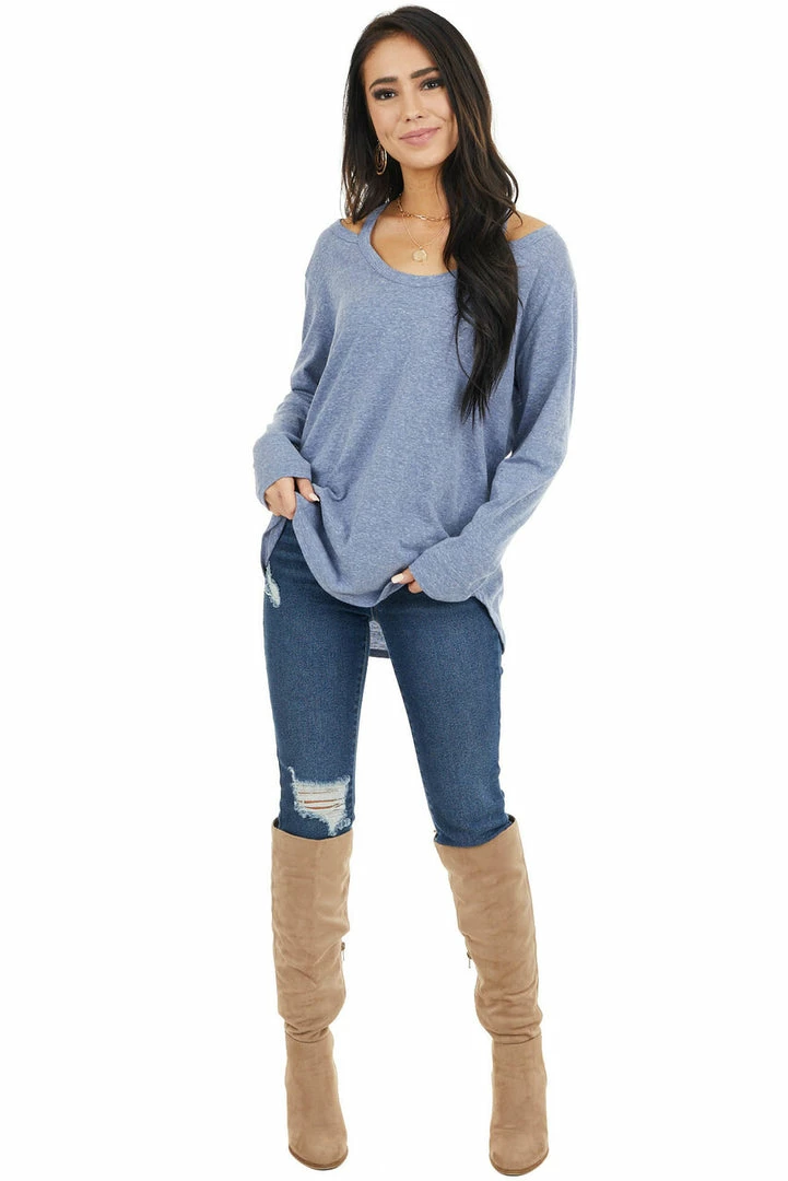 - Dusty Blue Shoulder Cutout Long Sleeve Stretchy Knit Top