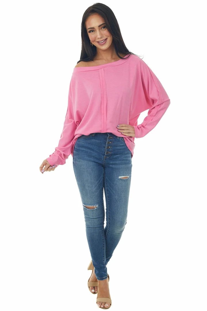 - Hot Pink Long Sleeve Knit Top with Raw Seam Details