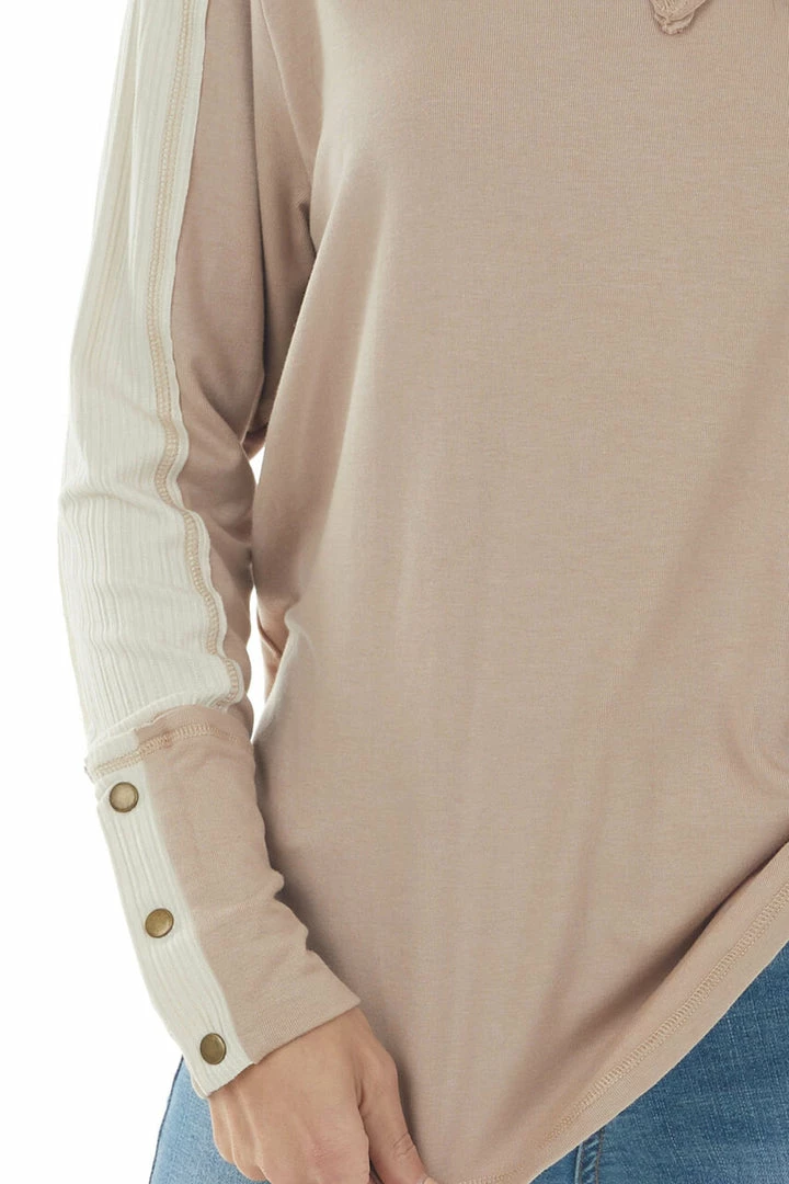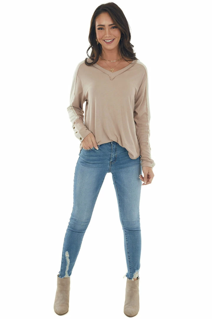- Latte V Neck Long Sleeve Exposed Seam Knit Top