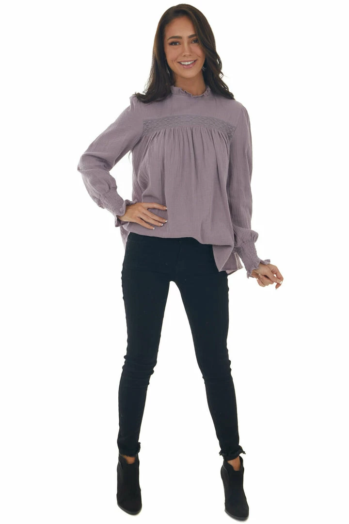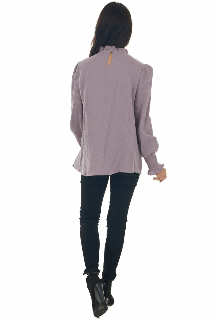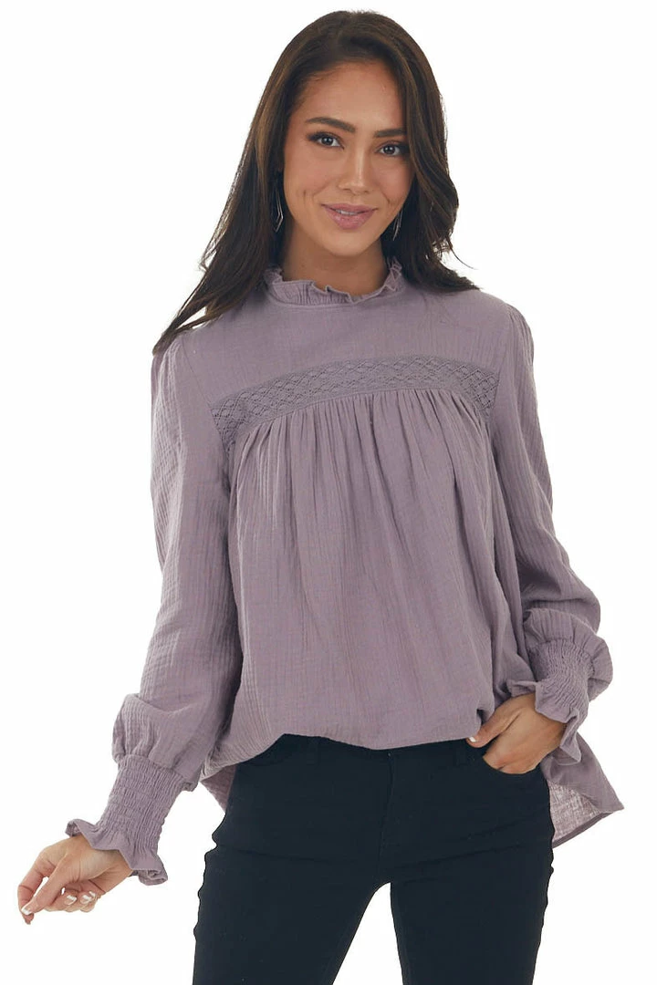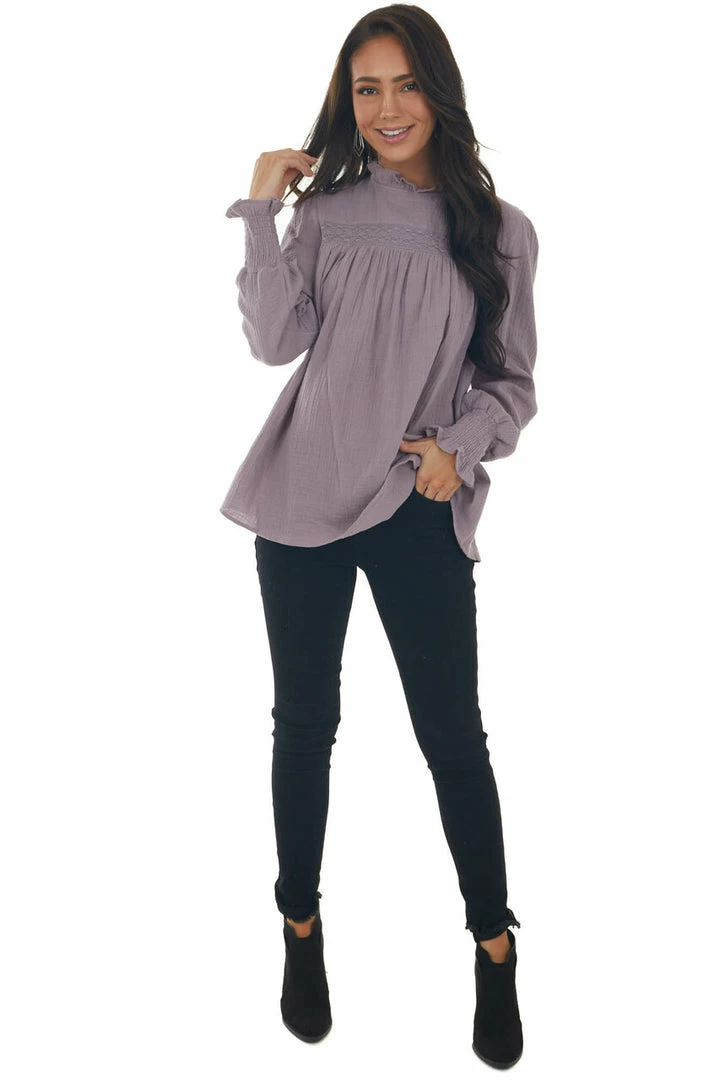 - Mauve High Frill Neck Lace Detail Yoke Blouse