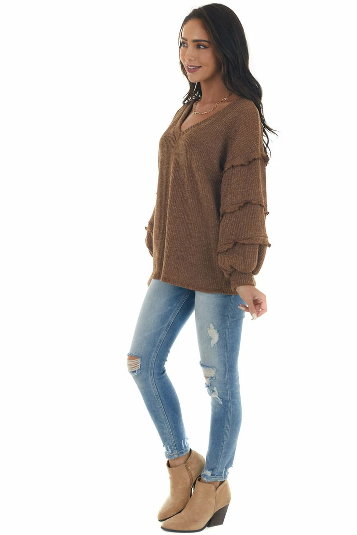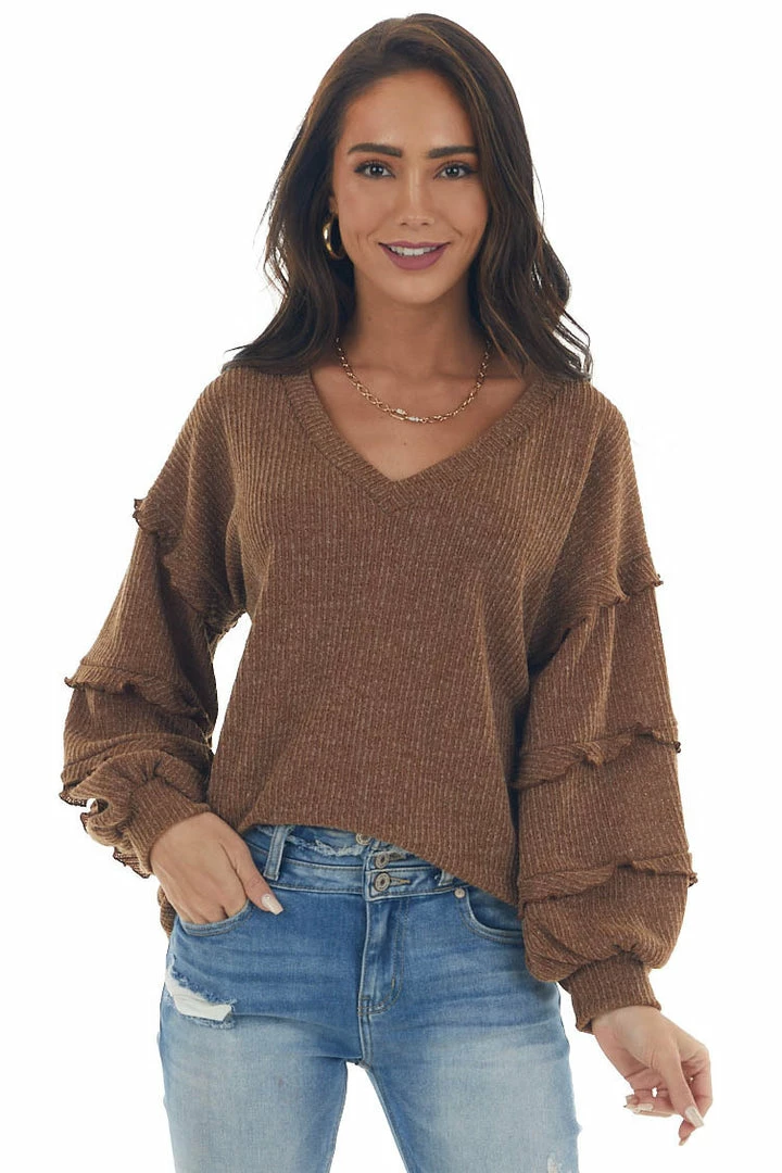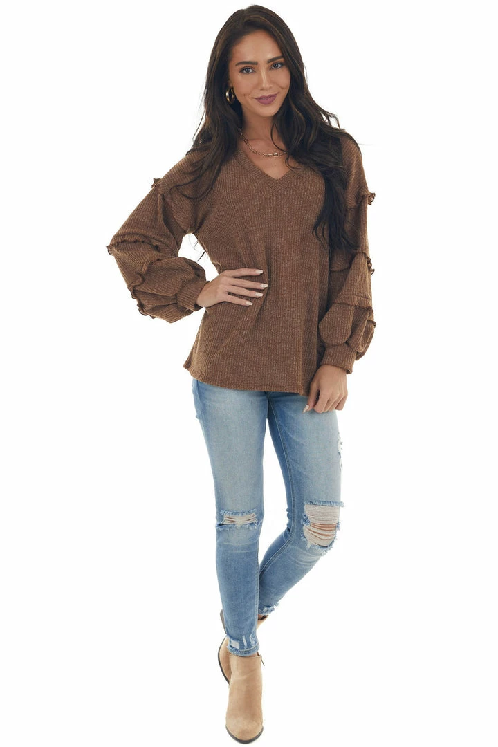 - Sepia Ribbed Knit Top with Ruffle Puff Sleeves