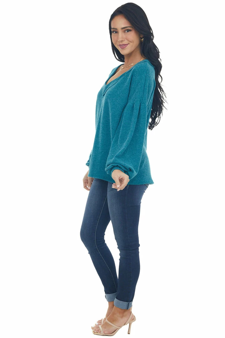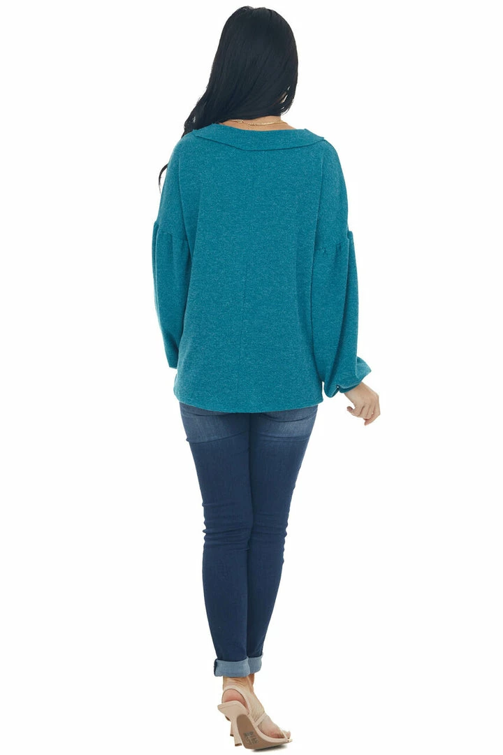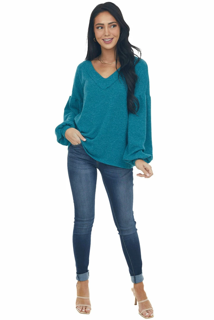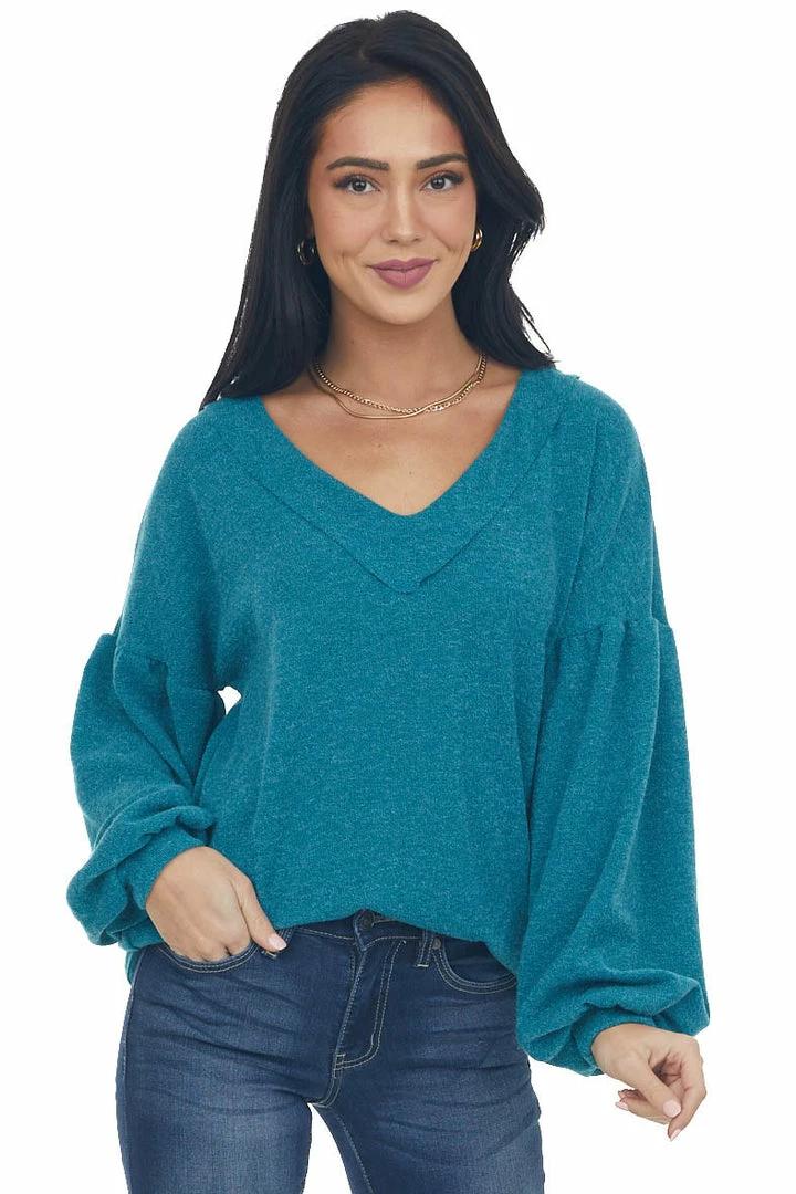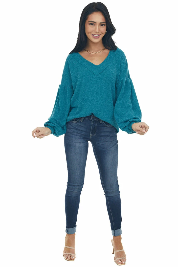 - Teal Reverse Seam V Neck Puff Sleeve Knit Top