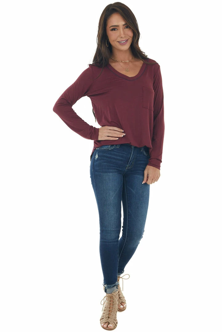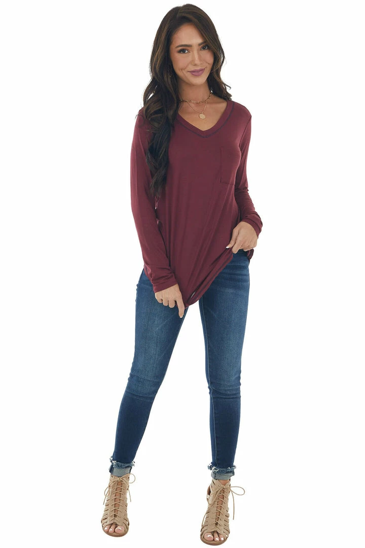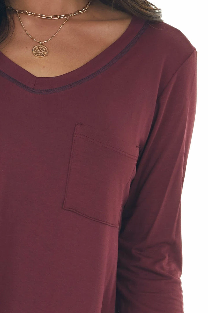 - Wine Exposed Stitch Chest Pocket Knit Top
