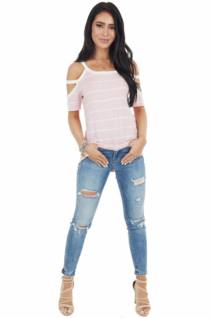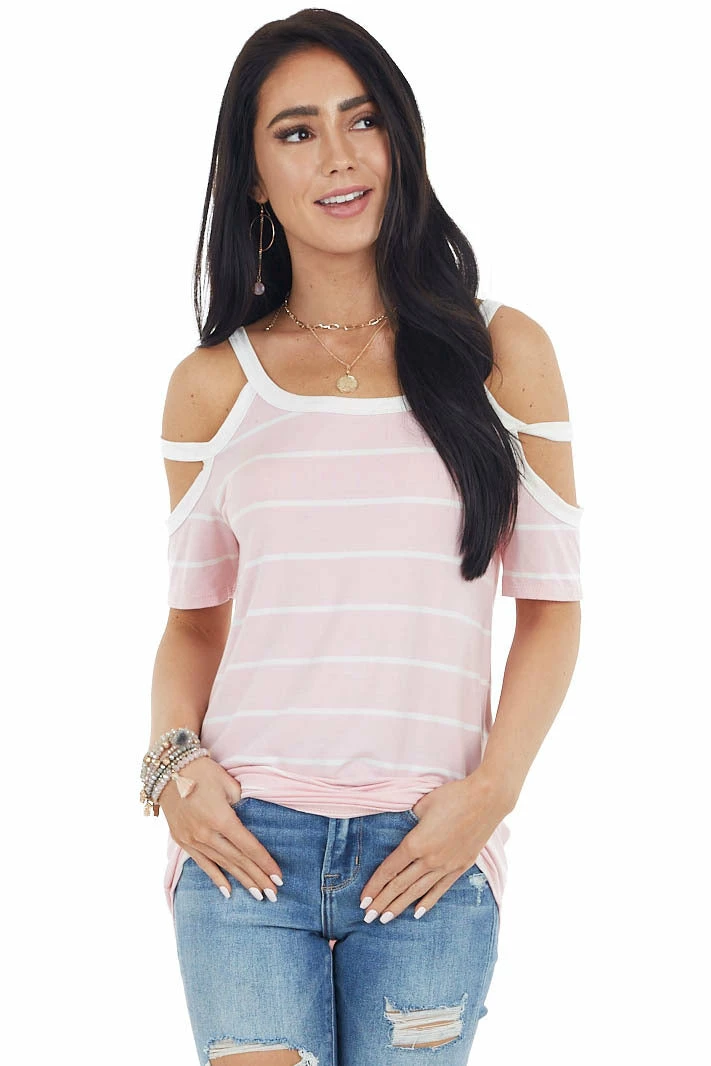 - Baby Pink and Ivory Striped Strappy Cold Shoulder Top