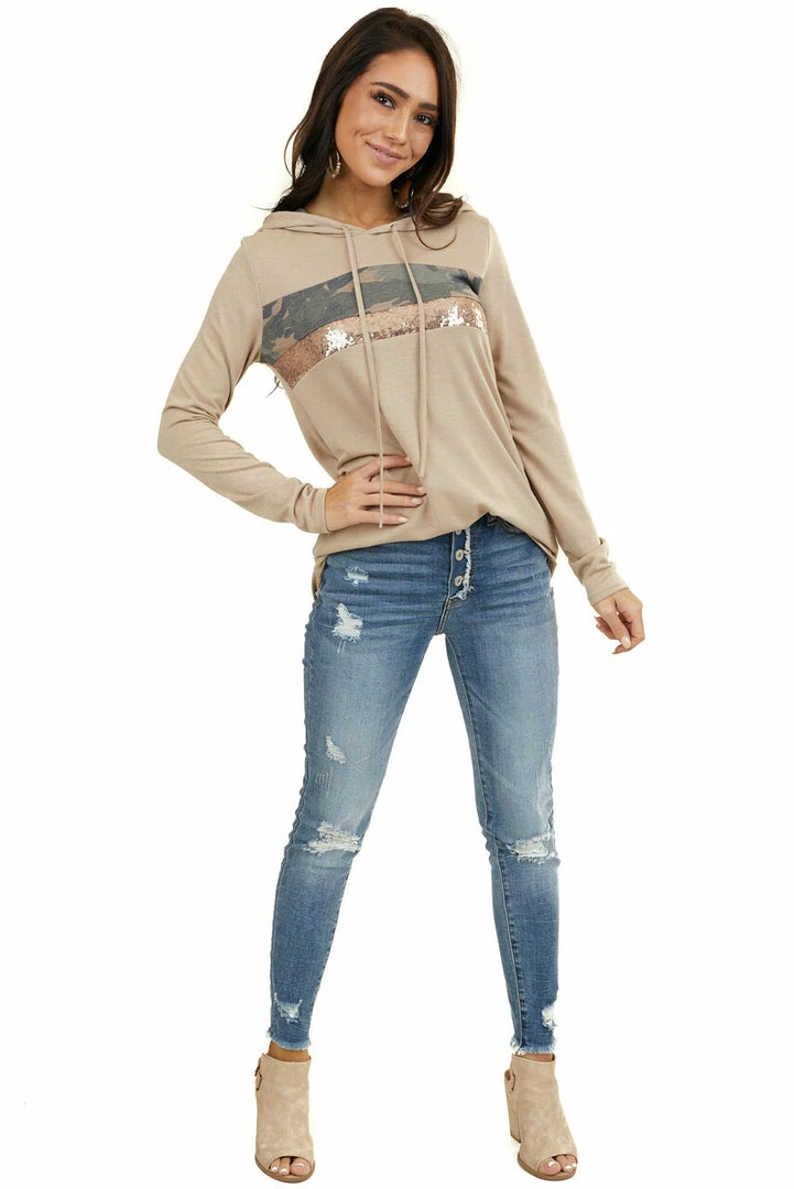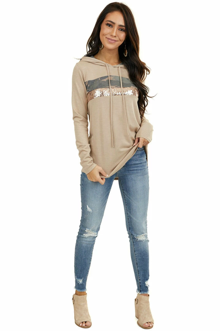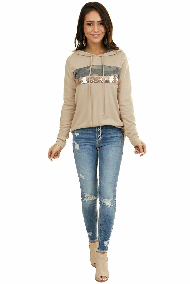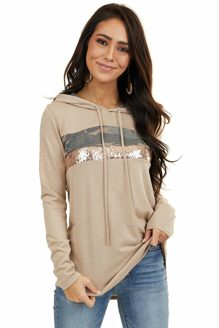 - Latte Long Sleeve Hoodie with Camo and Sequin Contrast