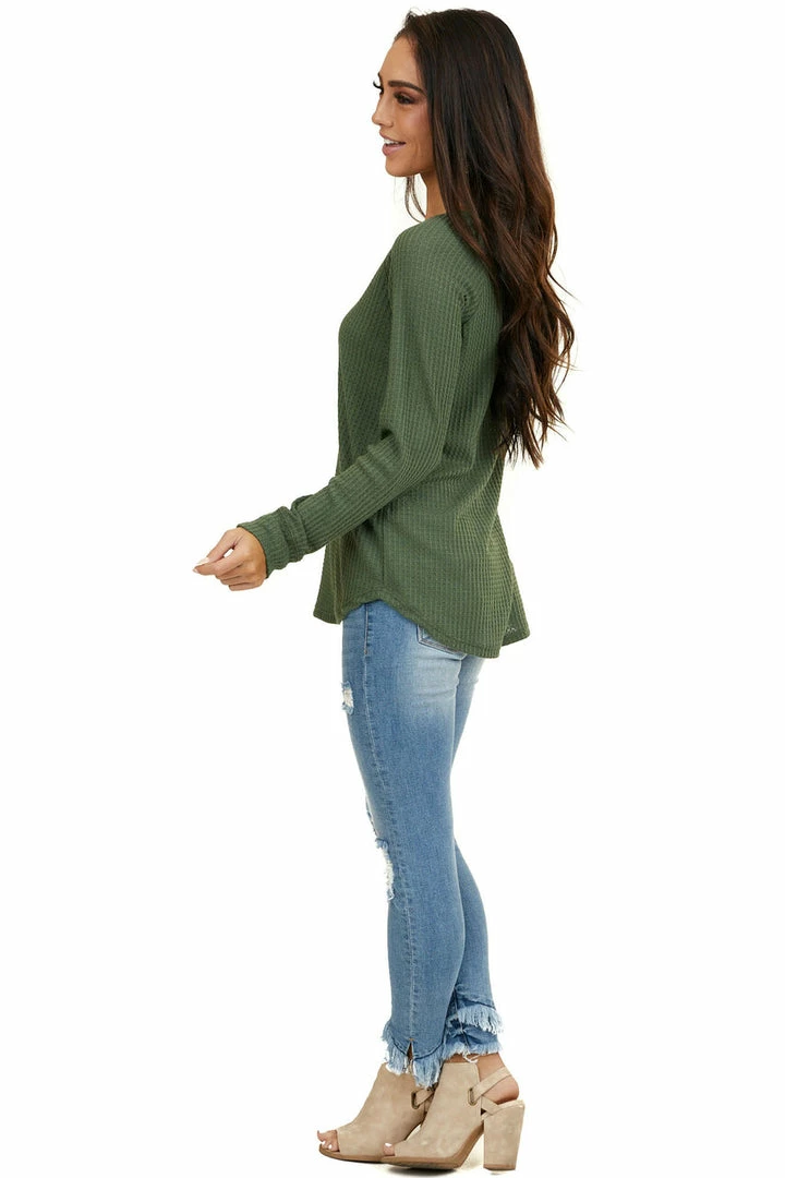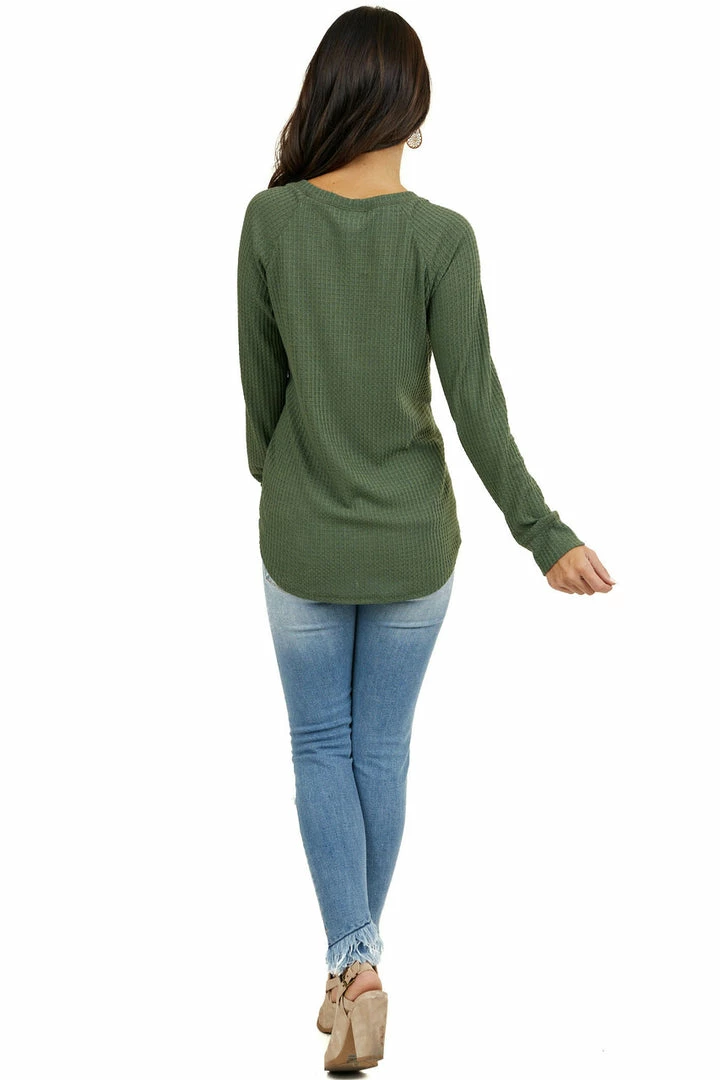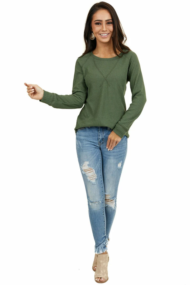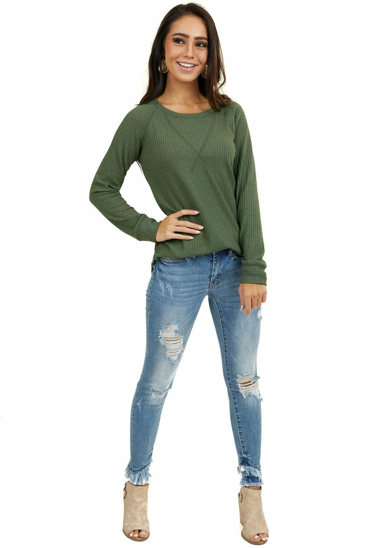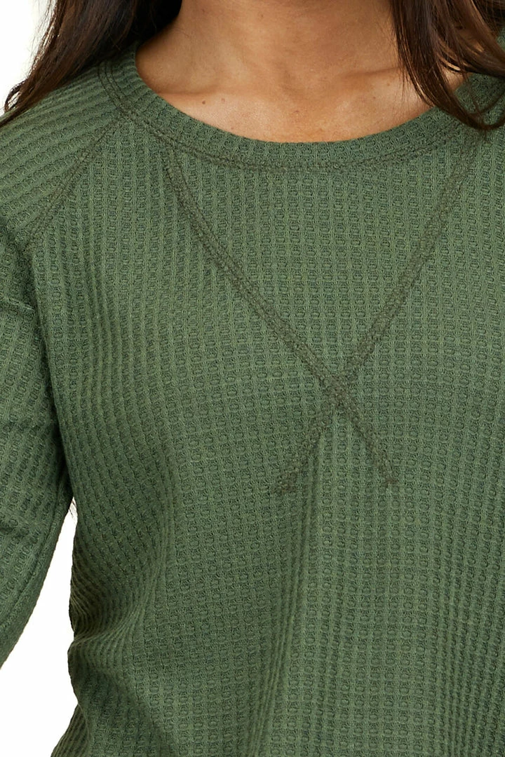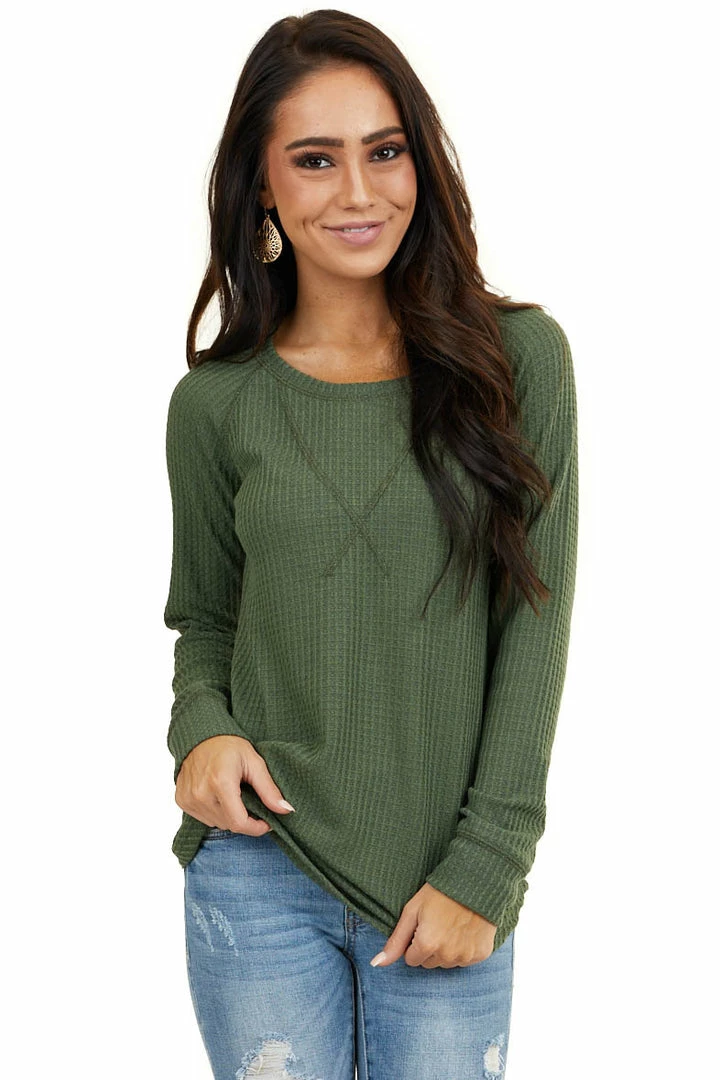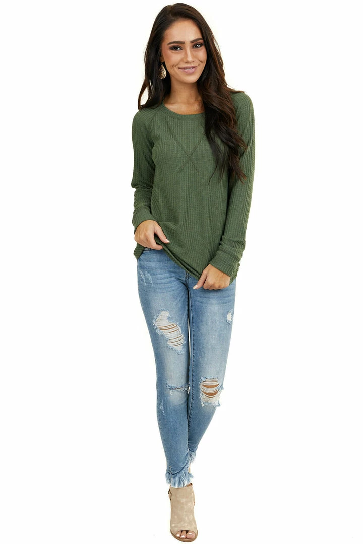 - Olive Green Waffle Knit Long Sleeve Top with V Stitch