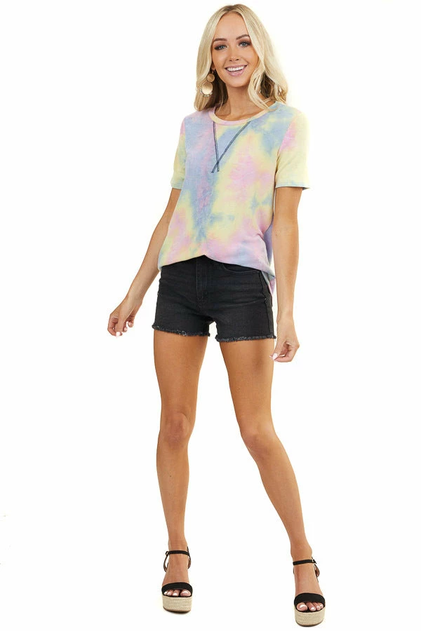 - Multicolor Tie Dye Short Sleeve Top with Rounded Neckline