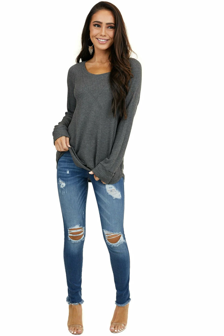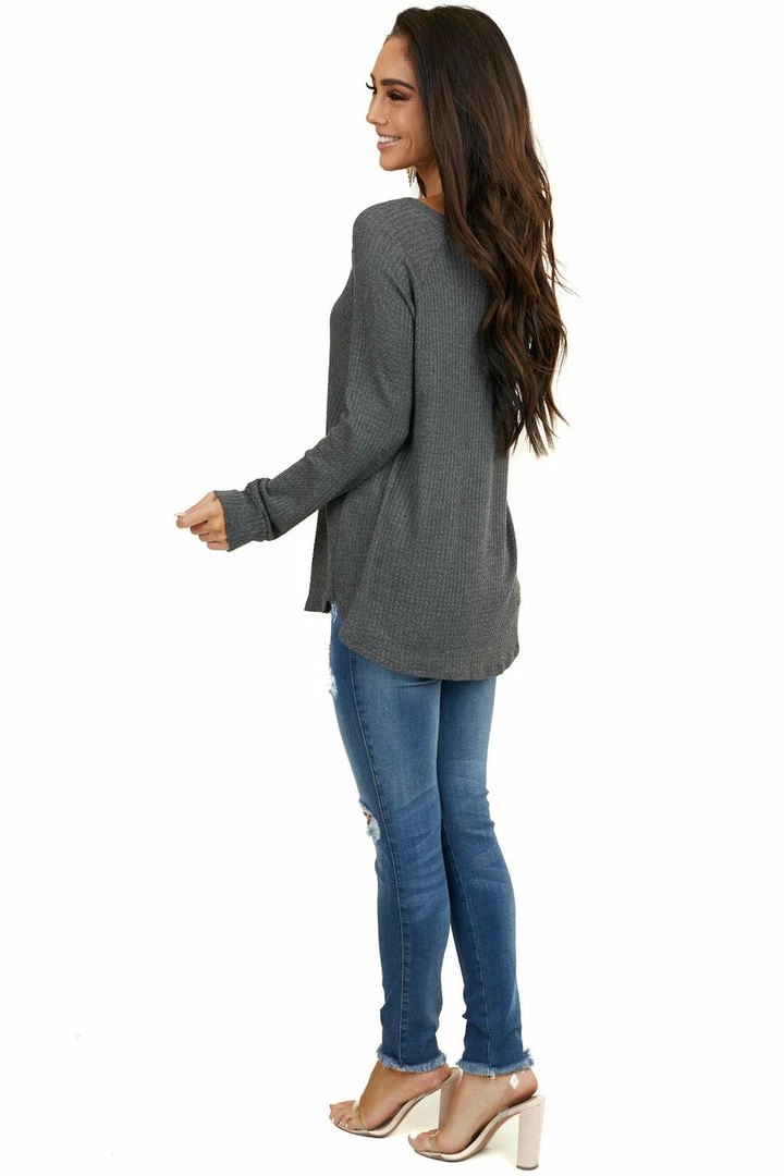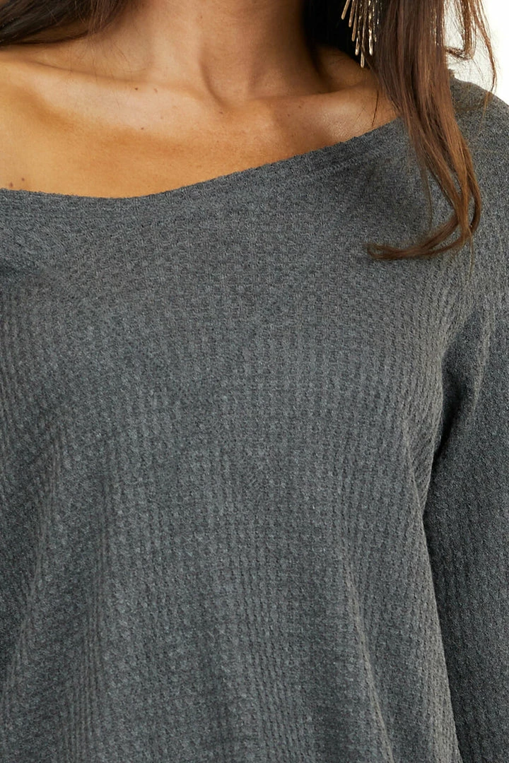 - Stormy Grey Waffle Knit Long Sleeve Top with V Stitch
