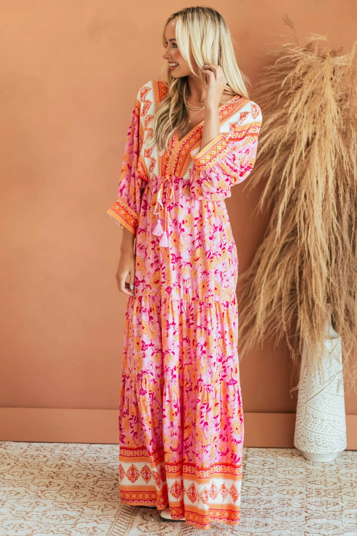 - Fuchsia Border Print Dolman Sleeve Maxi Dress