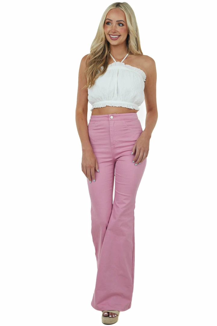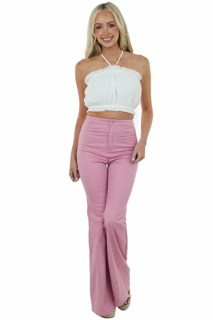 - Ivory Halter Neck Sleeveless Ruffled Crop Top