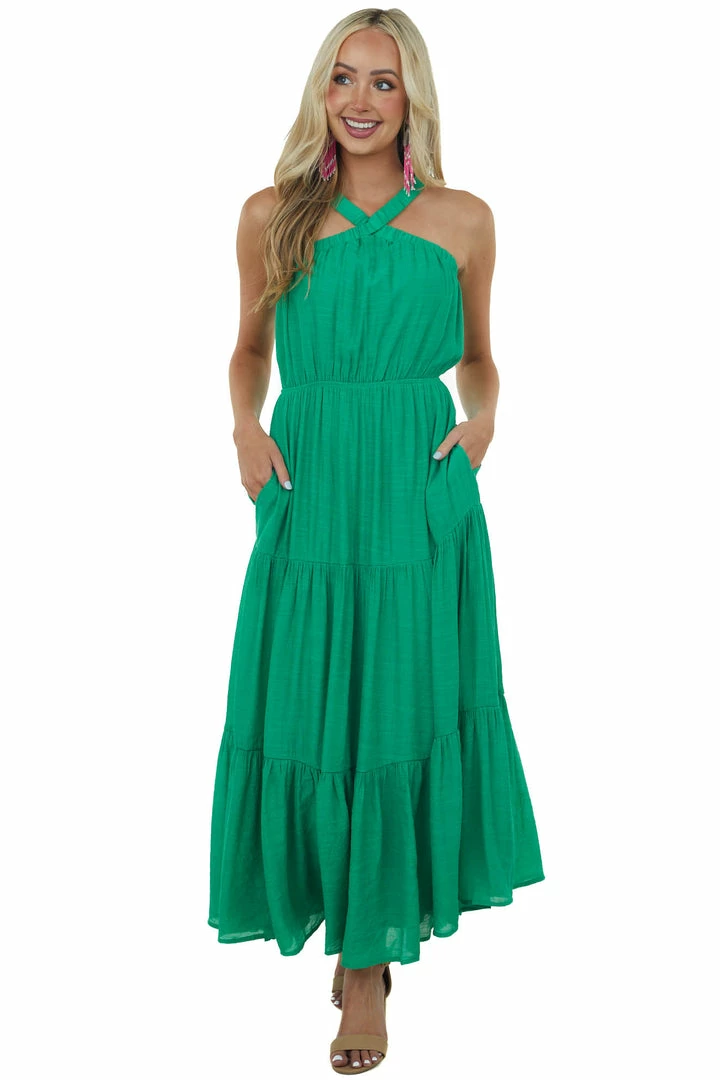 - Jade Elastic Halter Neck Tiered Maxi Dress