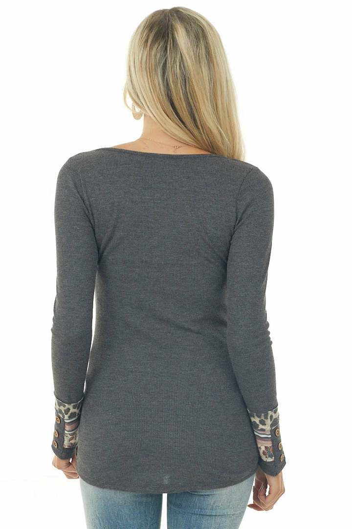 - Stone Grey Knit Top with Multiprint Cuff Detail