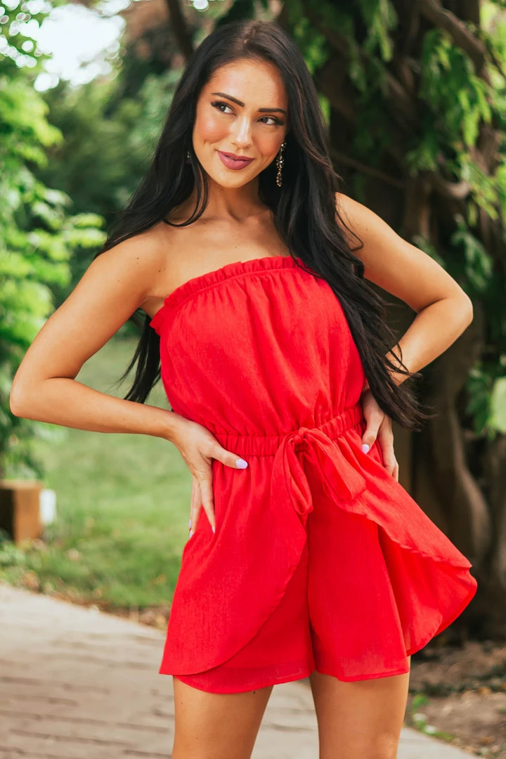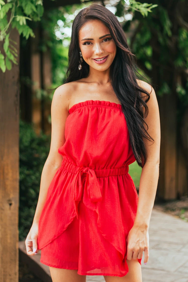 - Lipstick Red Shimmer Sleeveless Front Tie Romper