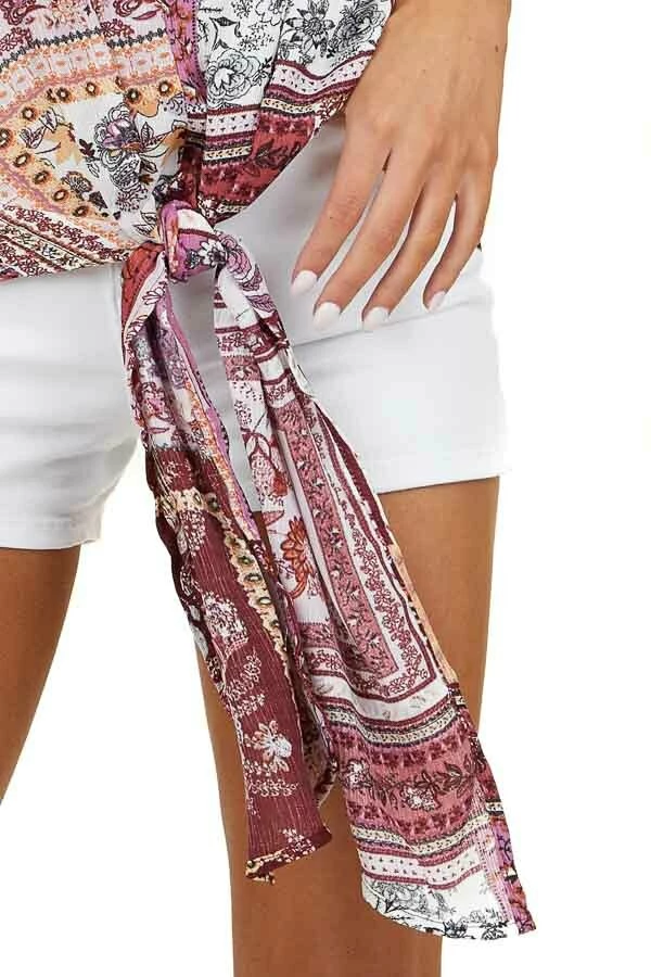 - Plum Floral Multi Print Sleeveless V Neck Top with Tie