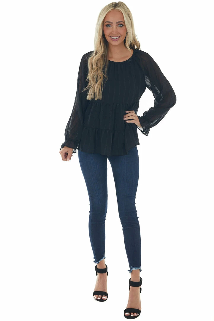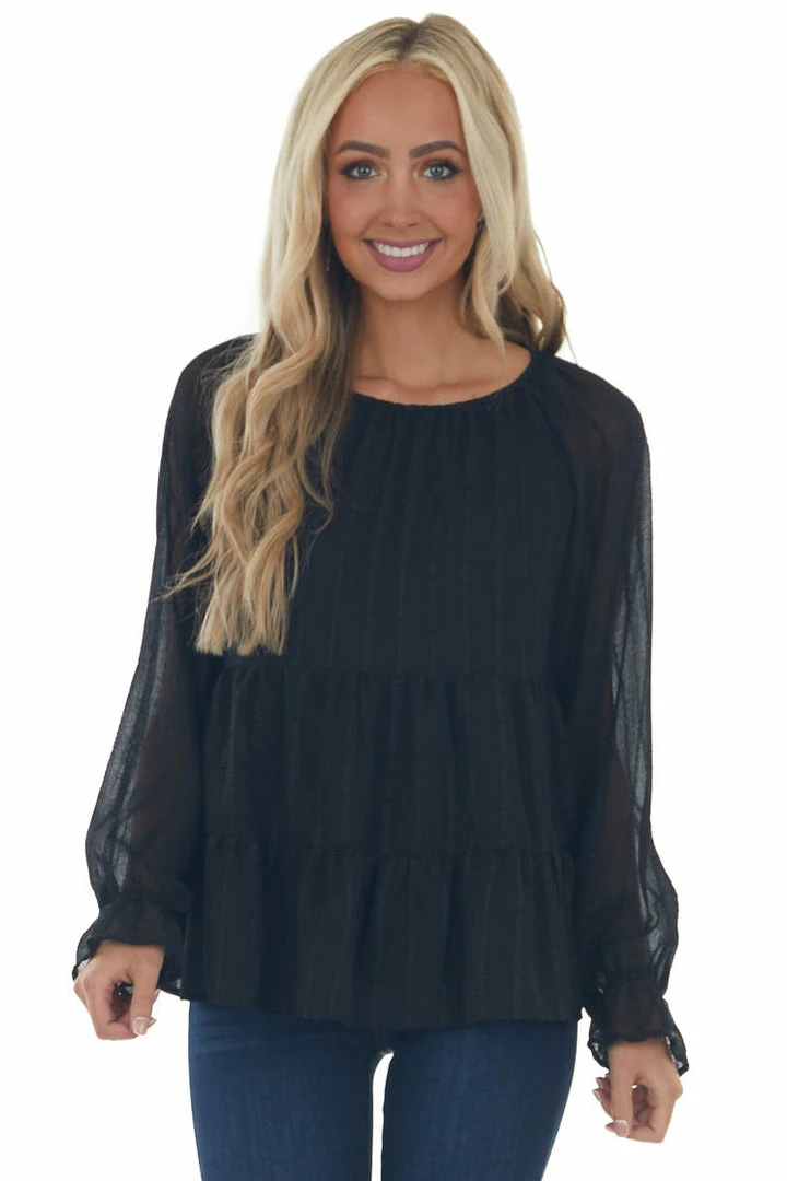 - Long raglan bubble sleeves with elastic ruffle cuffs