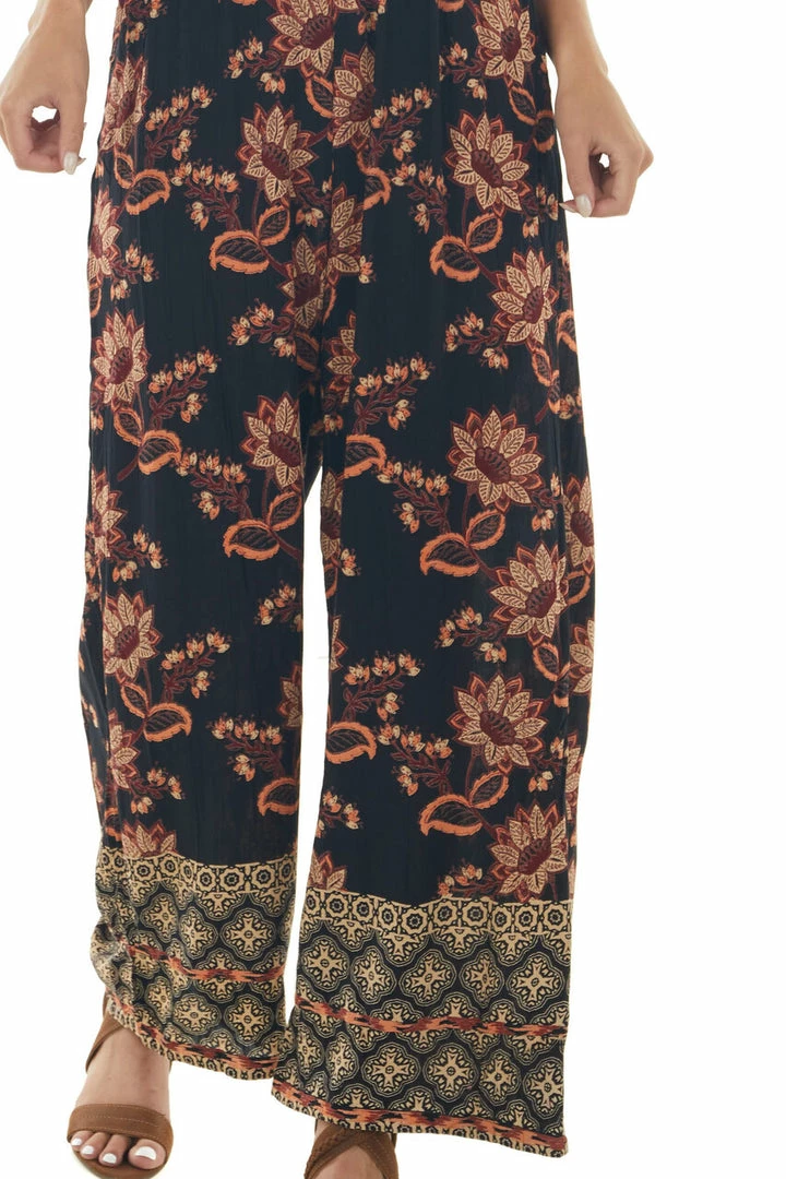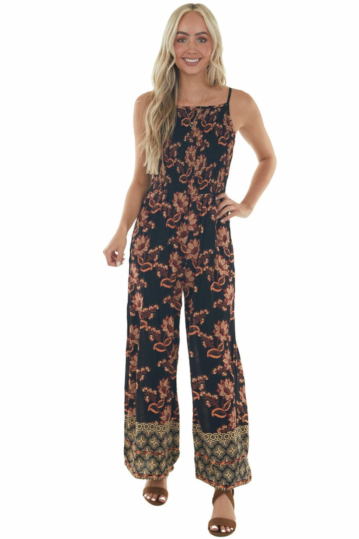 - Black Floral Smocked Bodice Wide Leg Jumpsuit
