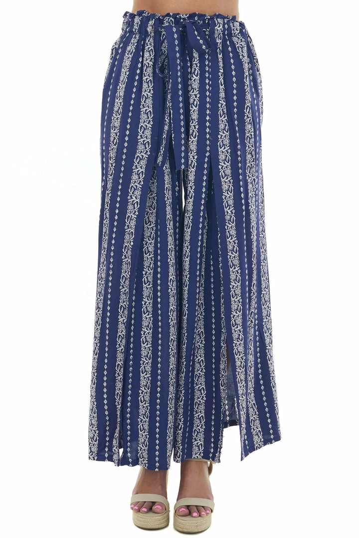 - Navy Floral Striped Front Slit Wide Leg Pants