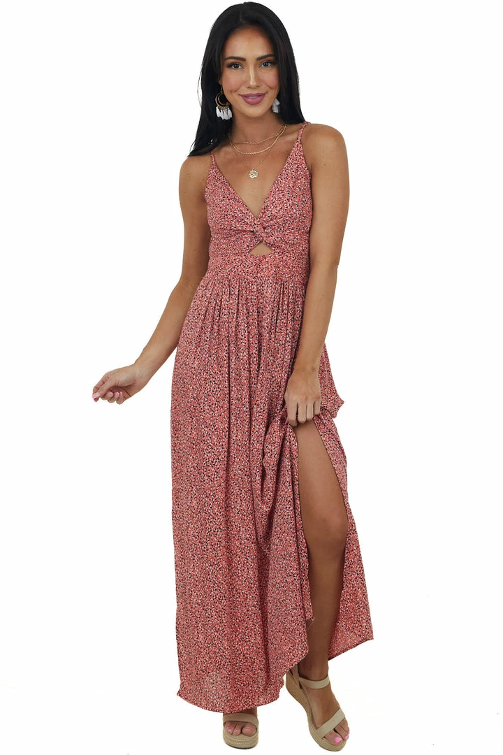- Coral Printed Front Twist Sleeveless Maxi Dress