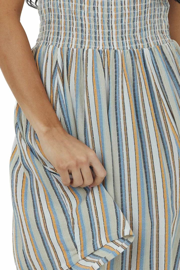 - Dusty Blue Striped Sleeveless Smocked Dress