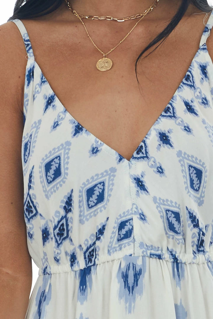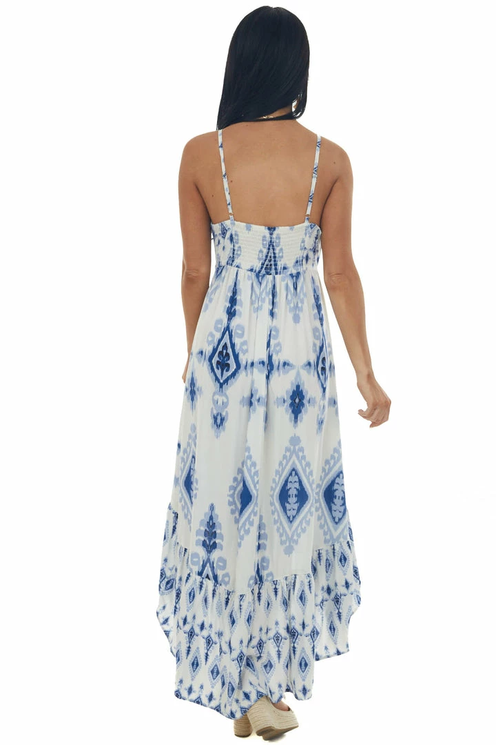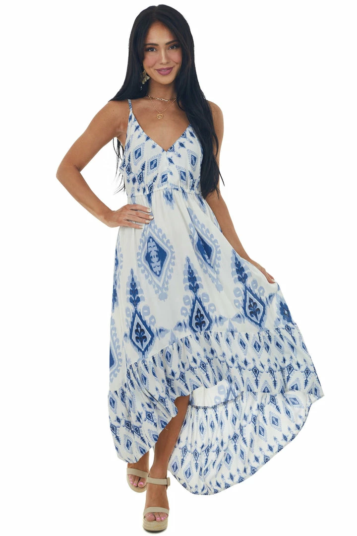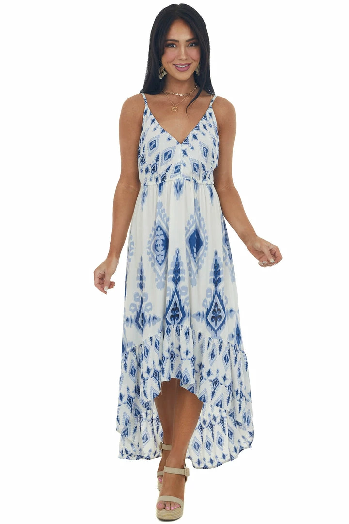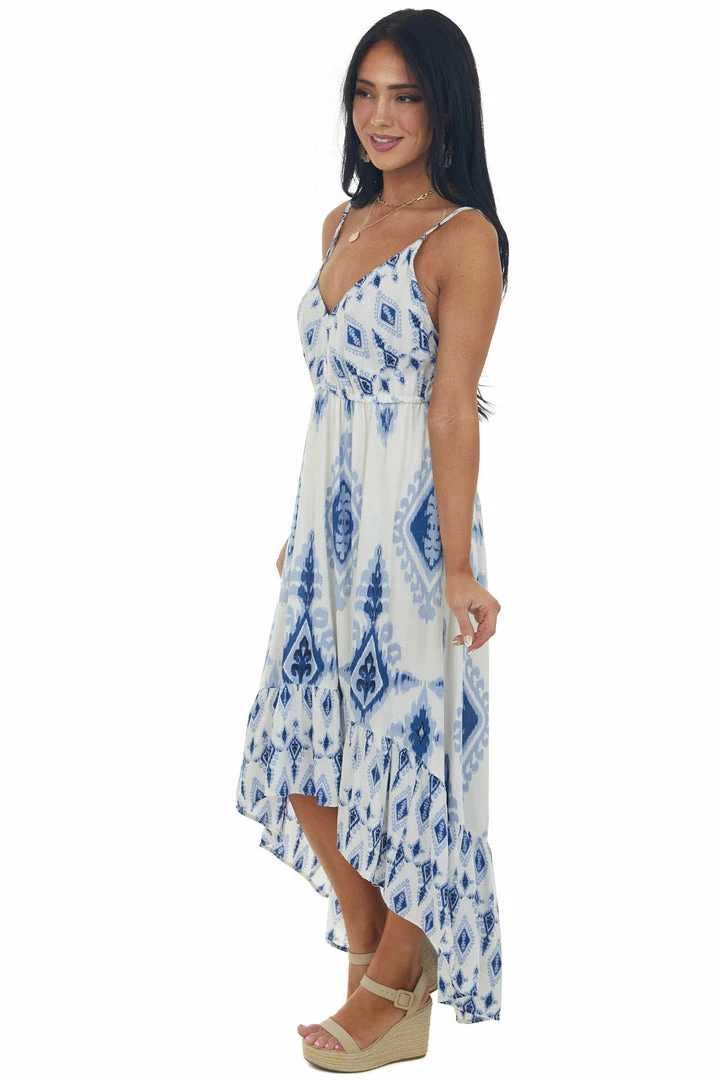 - Ivory Printed V Neck Sleeveless High Low Dress