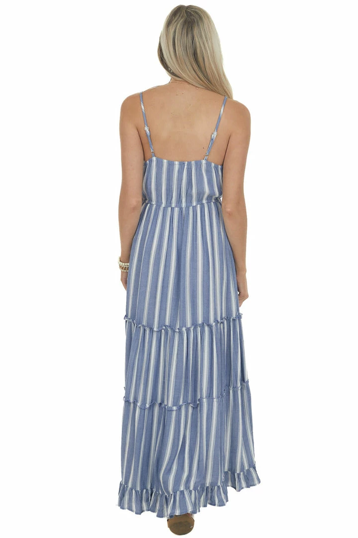 - Steel Blue Striped Tiered Surplice Maxi Dress