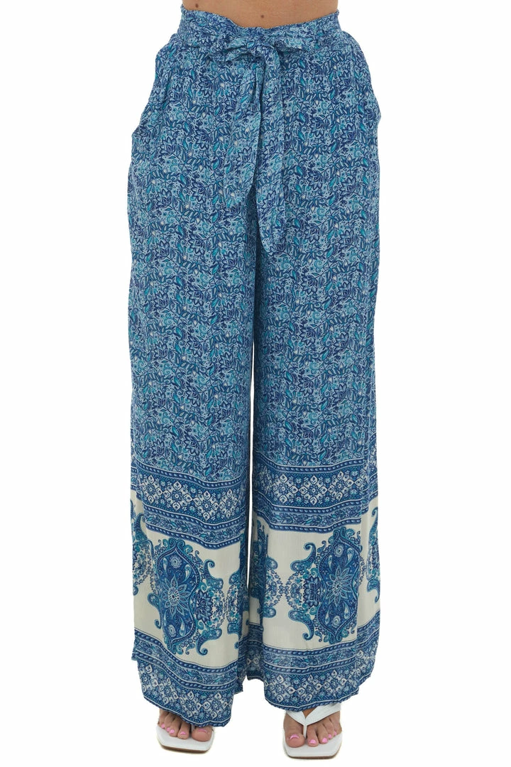 - Dusty Blue Floral Print Waist Tie Wide Leg Pants