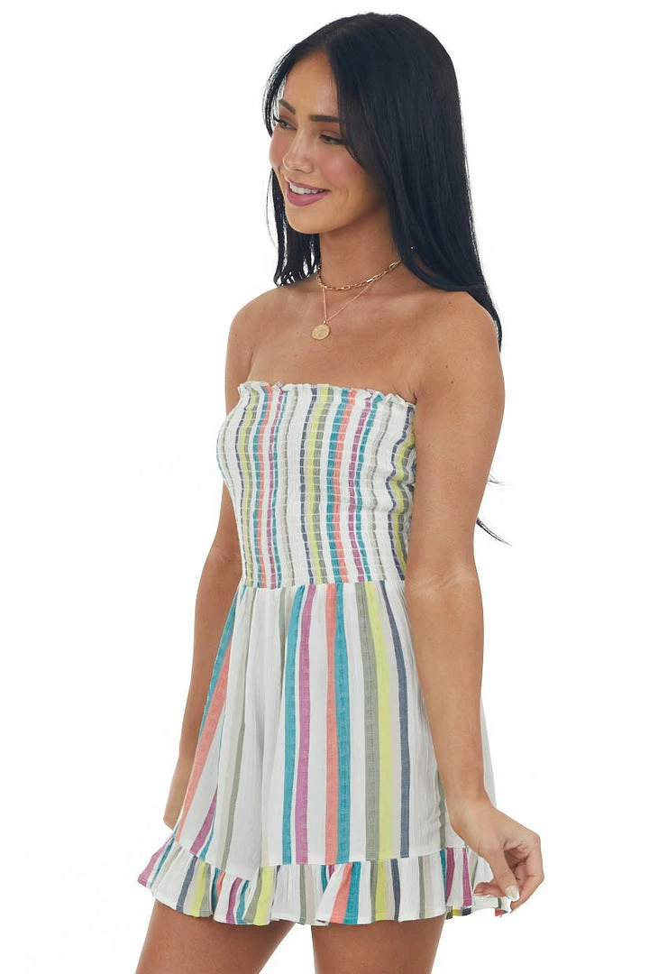 - Ivory Colorful Stripe Print Strapless Romper